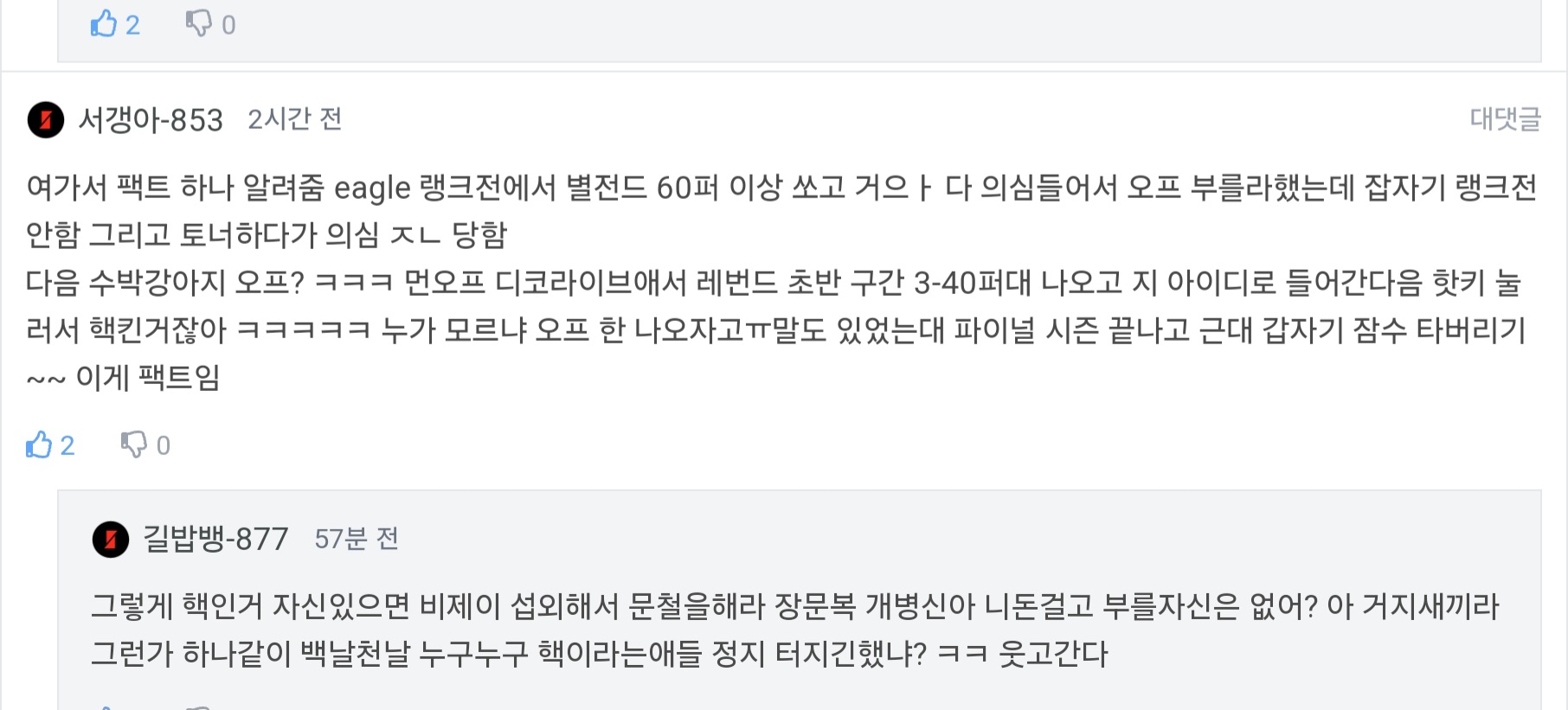대룰 랭크전 애들은 킥이나 위티 등등 메이저애들한테 디코라이브나 핵수사 서로 돈걸고 문철하는데 버닝예샷돌이들은 맨날 서로 의심만하네 ㅋㅋㅋㅋㅋ