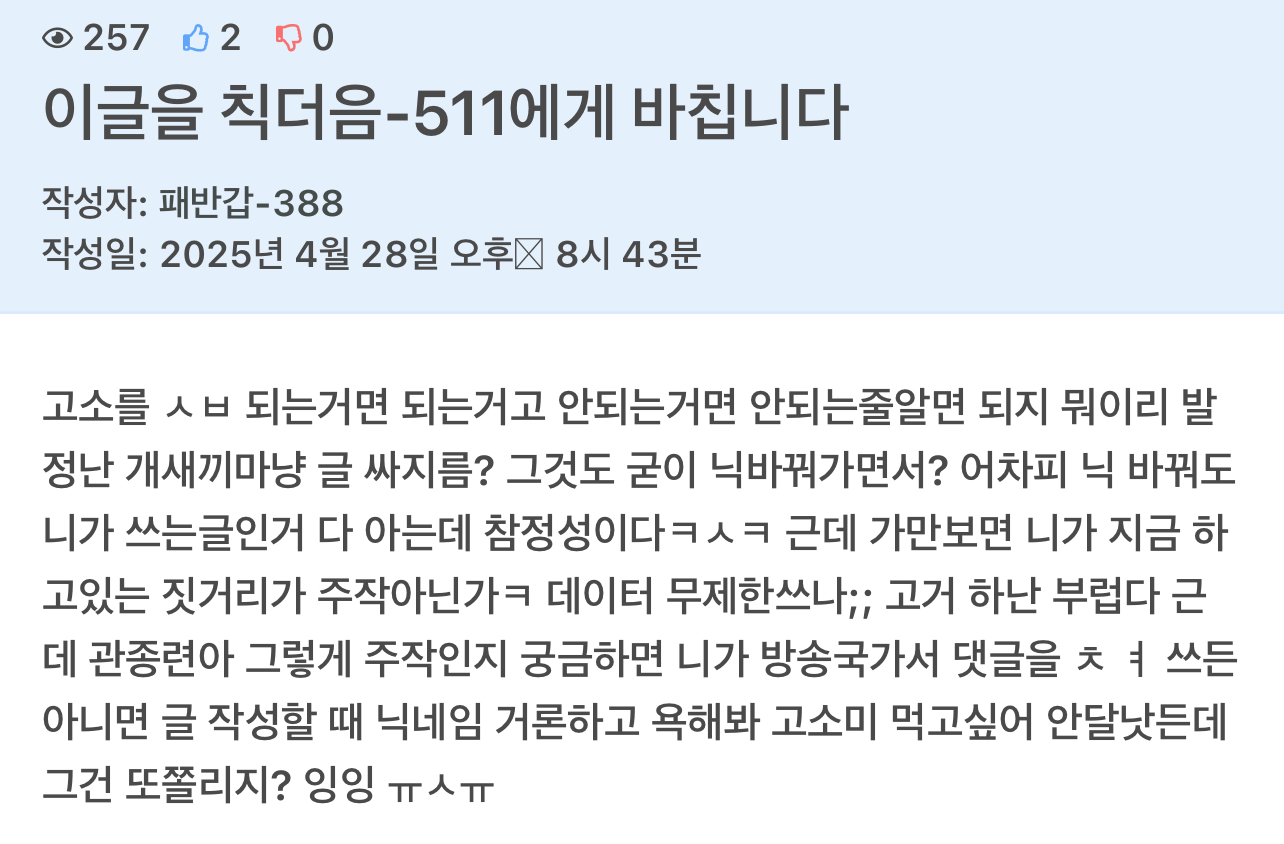 노력이 가상하다 가상해~~ 다른사람인것처럼 헐뜯는 구도 만들어서 게시판 싸~악 썰다 주주주주주작 또 들켜버렸노 우리 익명이~ 이제 좀 그만하고 빨래좀 하렴 방에서 냄새난다 이년아ㅋㅋㅋㅋ