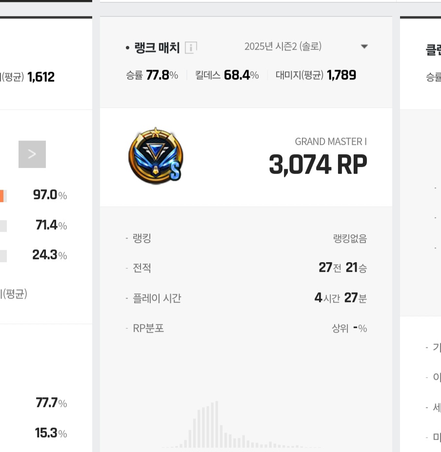 웬만한 랭커들도 내기 힘든 승률이랑 킬뎃인데