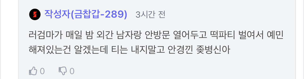 러검마가 매일 밤 외간 남자랑 안방문 열어두고 떡파티 벌여서 예민해져있는건 알겠는데 티는 내지말고 안경낀 좆병신아