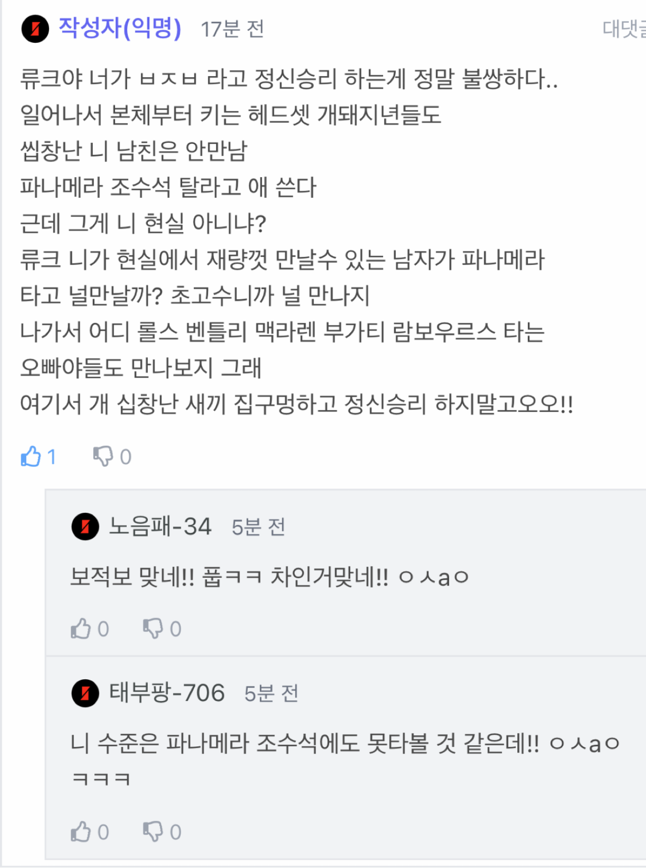그래 ㅅㅂ 이런 게시글 올리는 너같은 샠기들때문에 피해보는 거라곤 생각 안하냐 ㅅㅂ러마