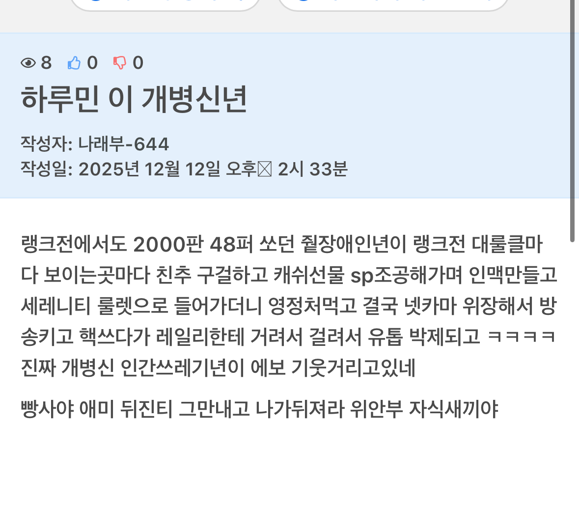 패드립 안하신다는것도 구라였어요?.. 어디까지 구라에요 님.. 저 하루민 아니에요 아무리 싫은 사람이어도 지능지수가 오리가 아닌이상 인간이라면 최소한 저런 수준 낮은 핵쟁이가 짓거리는거 무시하면되는데 님도 같은 수준낮는 사람인거에요? 창피합니다 정말