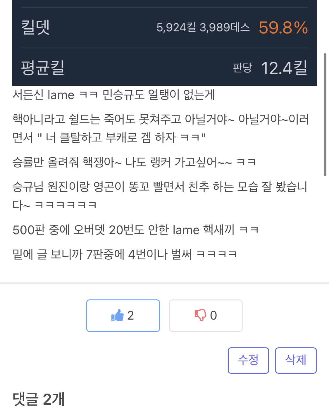 500판 중에 오버뎃 20번도 안한 lame 핵새끼 ㅋㅋ