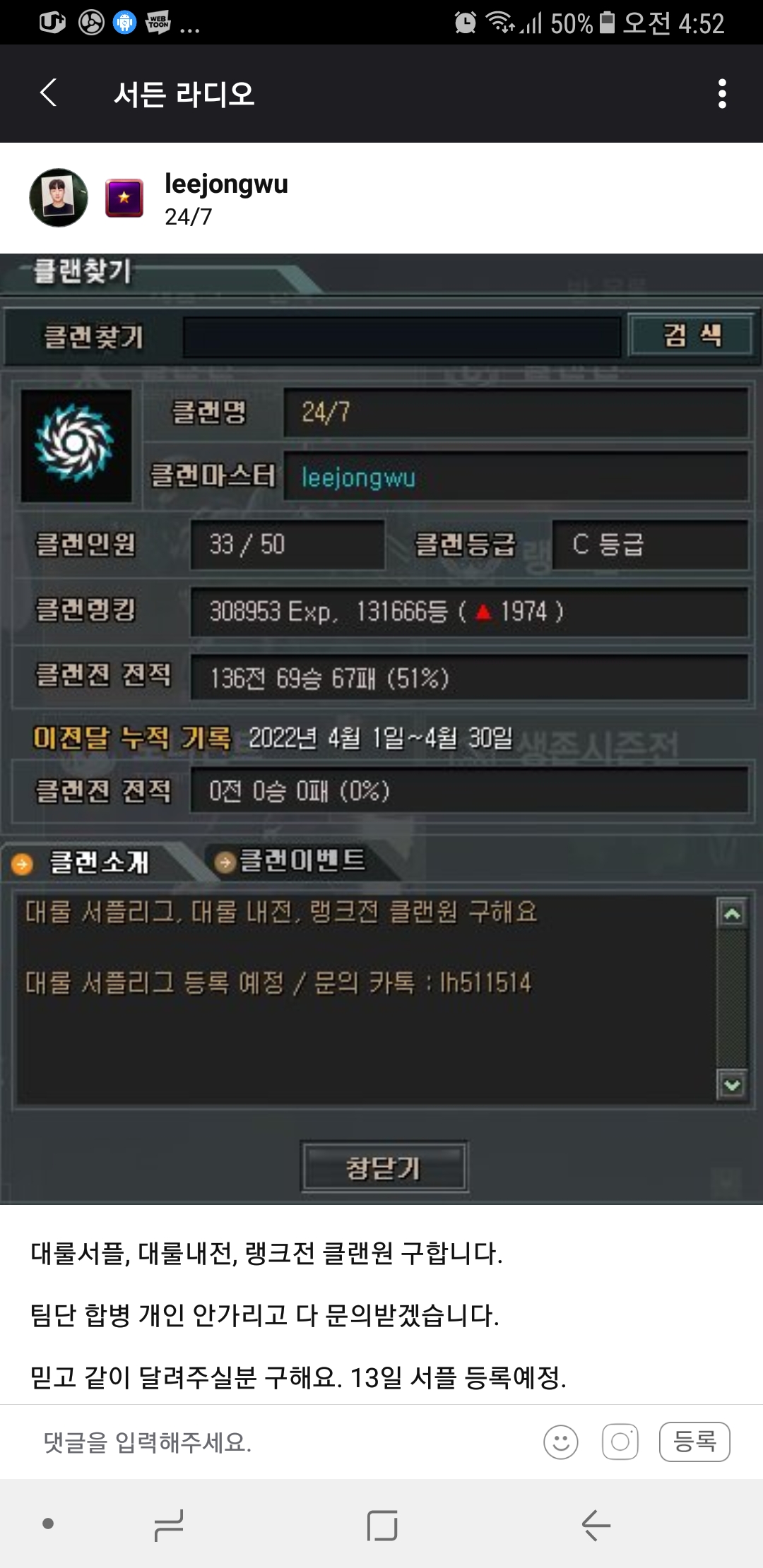 ㅋㅋㅋ 아니 서플 기준없냐? 그냥 클전잘돌아가는 클랜이면 되나보나 ㅋㅋㅋ 저런병신클도 되는거보니깐