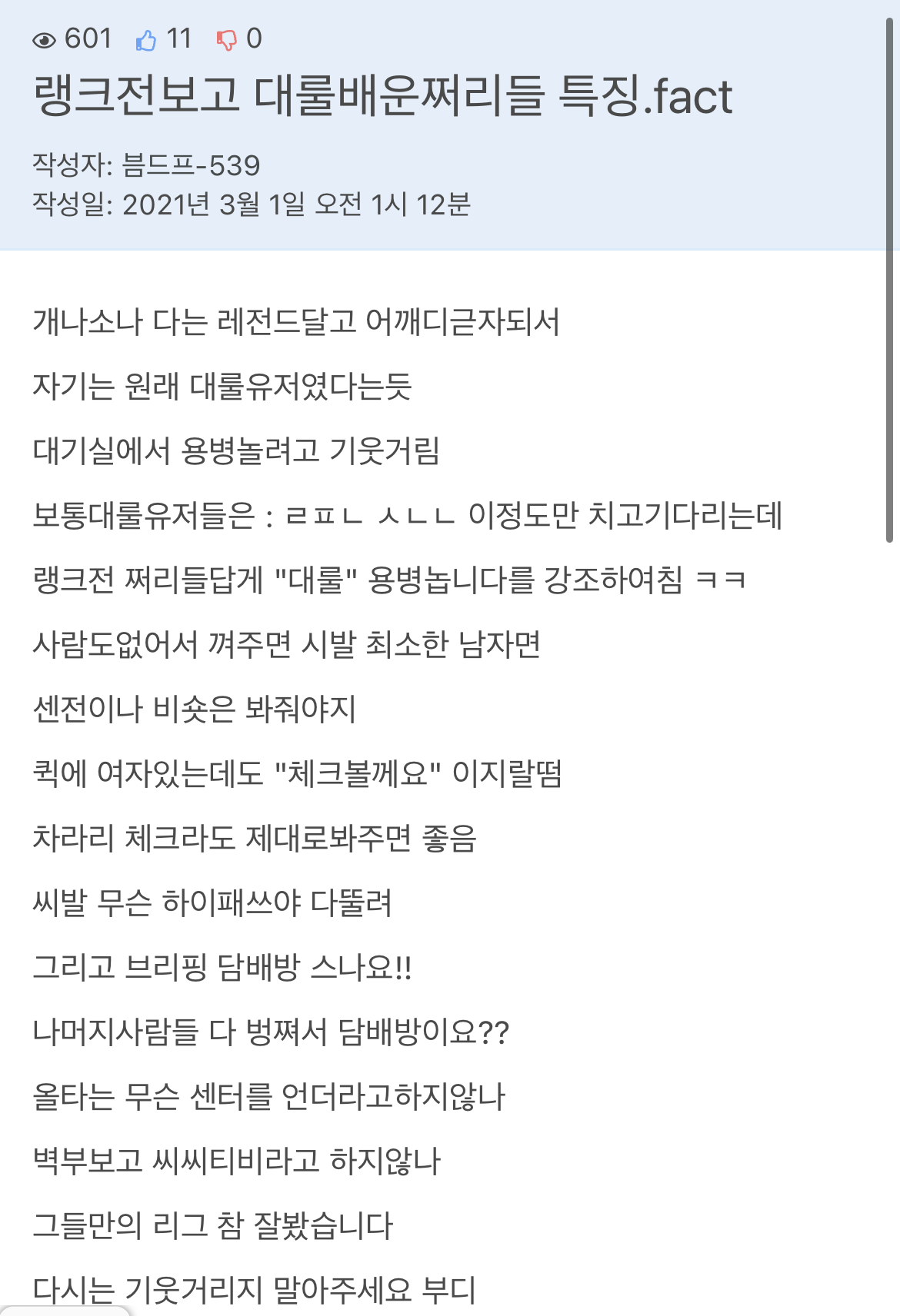 맙프남 글 다 지웠네 랭크전방송충병신 풉ㅋㅋ