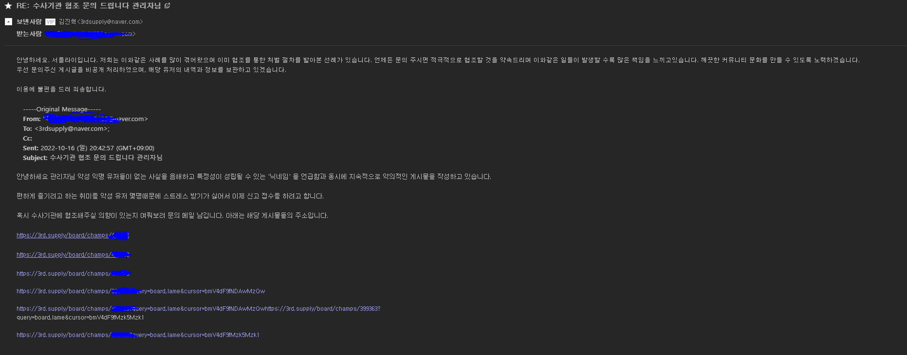 빡통새끼임? 아래가 보낸 메일이고 위에 내용이 서플에서 보낸 답장임 ㅋㅋ