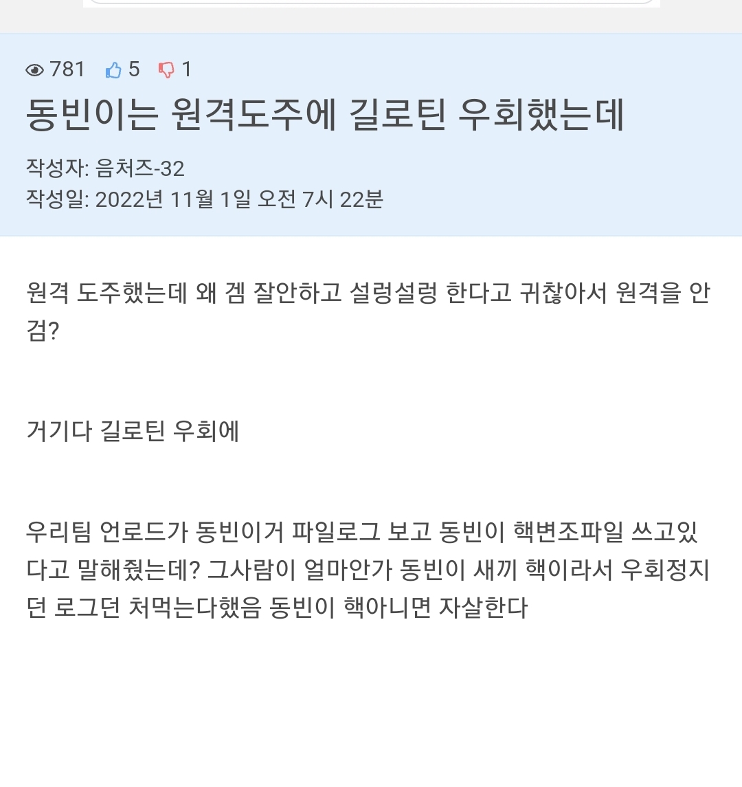 핵으로 우회정지 했다고 하는게 지금 정지막은 상황이 딱 들어맞네 동빈이 여자친구정90일 정지 기간에 영구정지 로그터지면 개킹받겠네