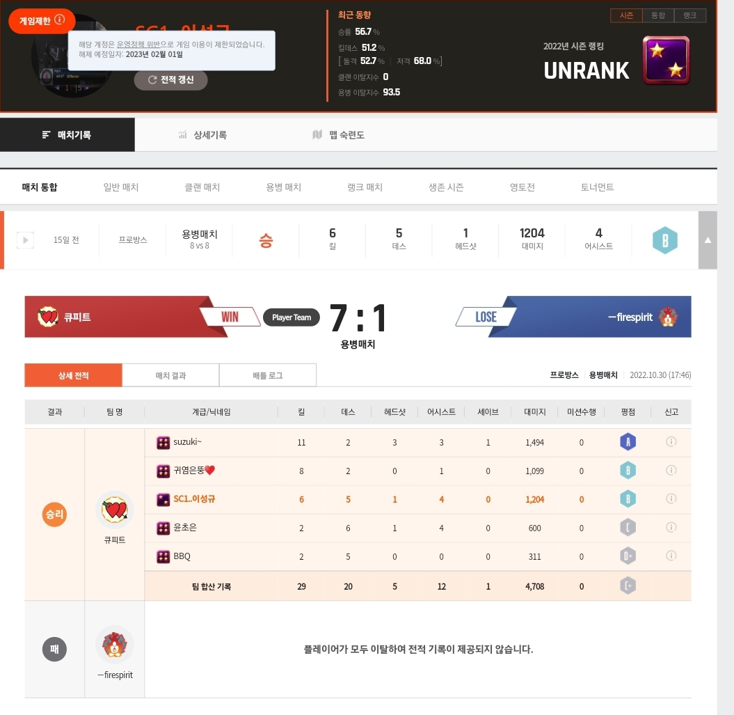 전과자 한지성의 클랜에서 전과자 이성규가 겜하고 90일정지를 당했다.