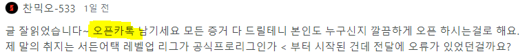 오픈톡 남기시라는 거 보니깐 본인도 떳떳하지 못하신 건 조금이나마 인지하시나 보죠? 웃음 밸이네요 ᄏᄏᄏᄏᄏᄏᄏ