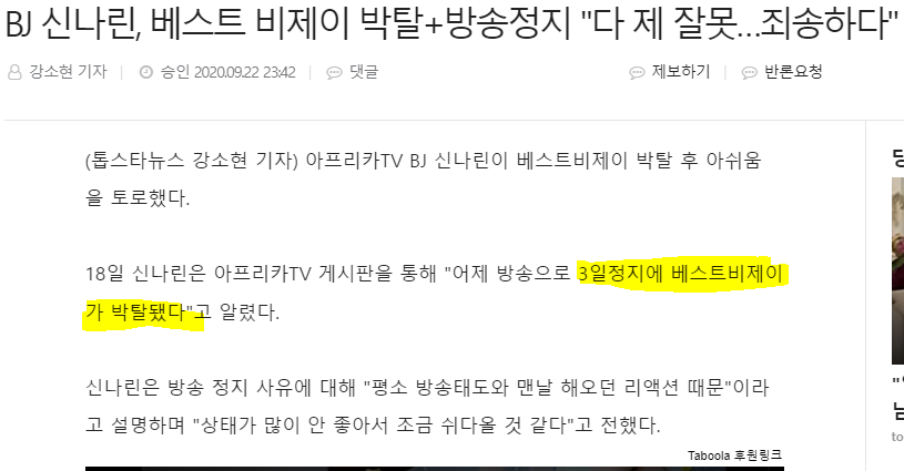 ?? 안 잘렸는데요 최근 방송일 5월 10일 자로 그 이후 개인 사정 혹은 본업 때문에 방송을 쉬고 계신 거 일 수도 있죠? 그리고 아프리카 티브이는 방송 정지와 함께 베스트 비제이 잘리는 걸로 알고 있습니다.