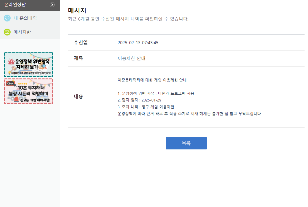 우선 제 계정은 1월 29일 비인가프로그램 사용이 탐지되어 영구 정지를 받았습니다. 저는 이를 2025년 2월 15일 금일 확인하게 되었습니다.