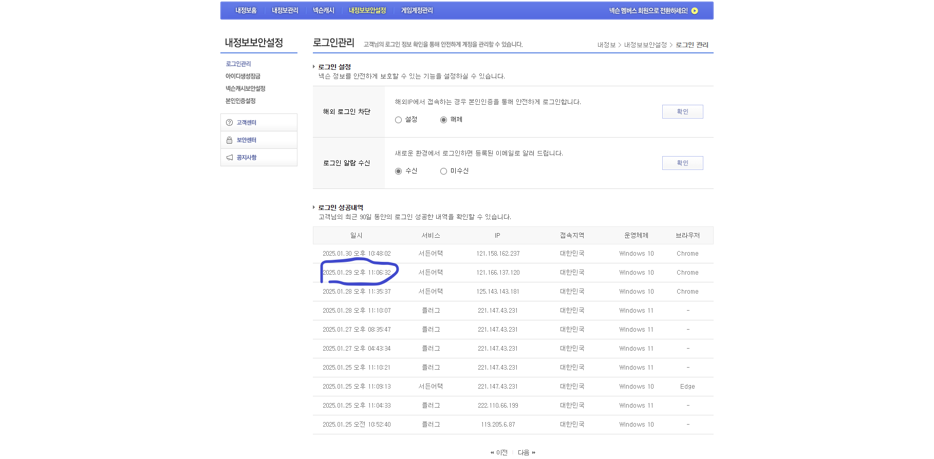 [붙임5] 2025년 1월 29일 로그인 IP (지인 플레이, 불법프로그램 탐지 당일)