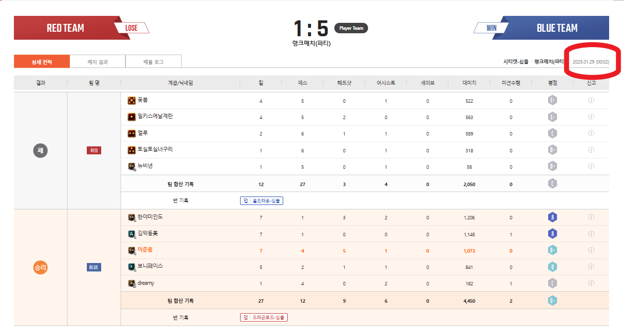 [붙임6] 2025년 1월 29일 게임내역 (지인 플레이, 불법프로그램 탐지 당일)