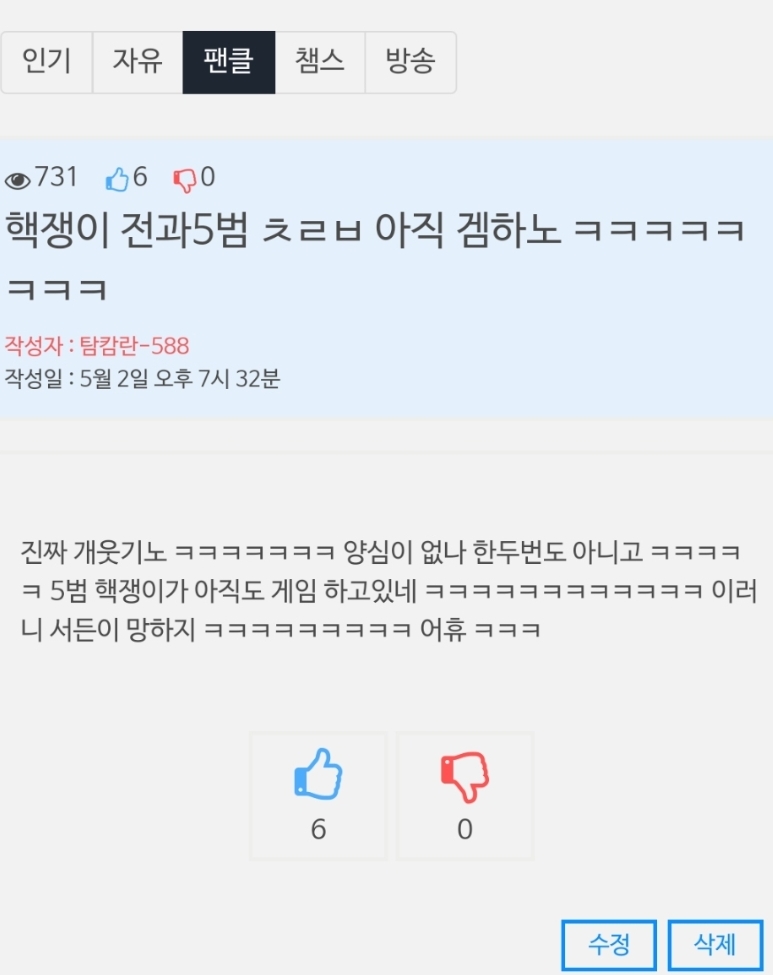 진짜 개웃기노 ㅋㅋㅋㅋㅋㅋㅋ 양심이 없나 한두번도 아니고 ㅋㅋㅋㅋㅋ 5범 핵쟁이가 아직도 게임 하고있네 ㅋㅋㅋㅋㅋㅋㅋㅋㅋㅋㅋㅋ 이러니 서든이 망하지 ㅋㅋㅋㅋㅋㅋㅋㅋㅋ 어휴 ㅋㅋㅋ
