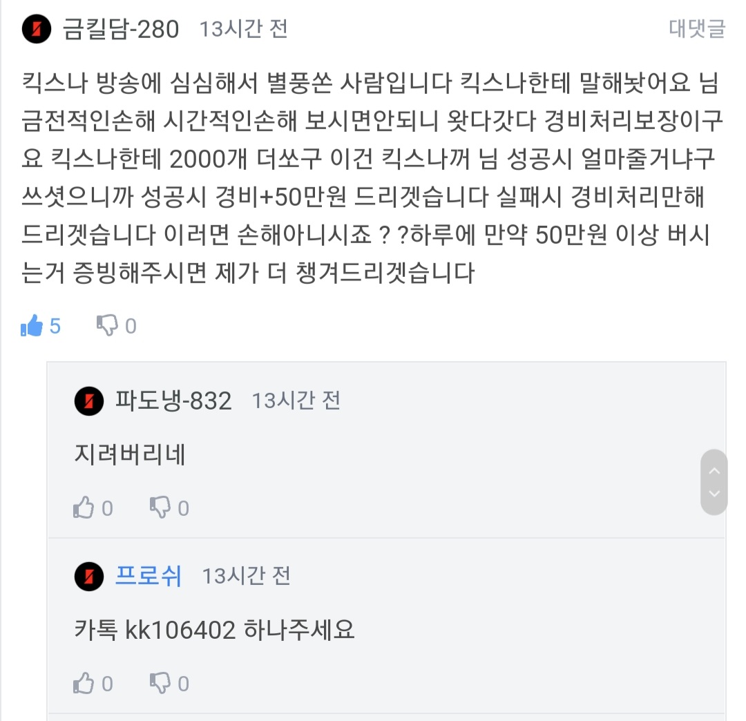 너카톡은 왜주니 ㅋㅋㅋㅋㅋ그냥피시방 옆자리도 말고 킥집에 가서 처음부터 끝까지 깨끗하게 게임하거라 옆에서겜하면 너 핵깔꺼잖아 ㅋㅋㅋ