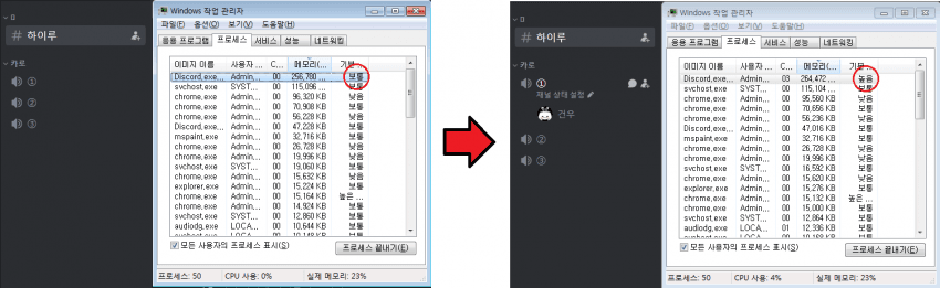 거지 같은 게 음성 방만 입장하면 프로세스 우선순위가 "보통" 에서 높음" 으로 바뀌더라고
