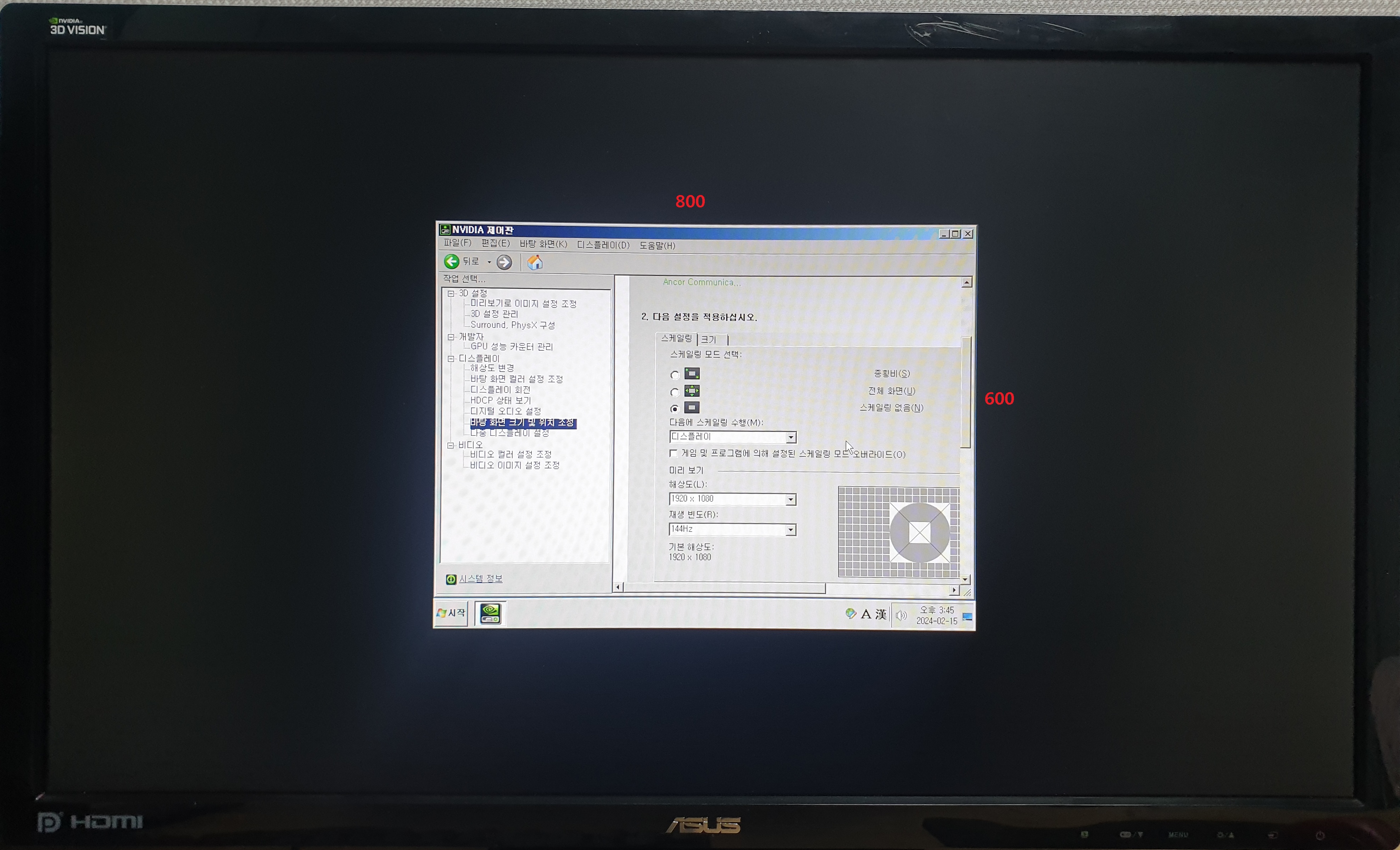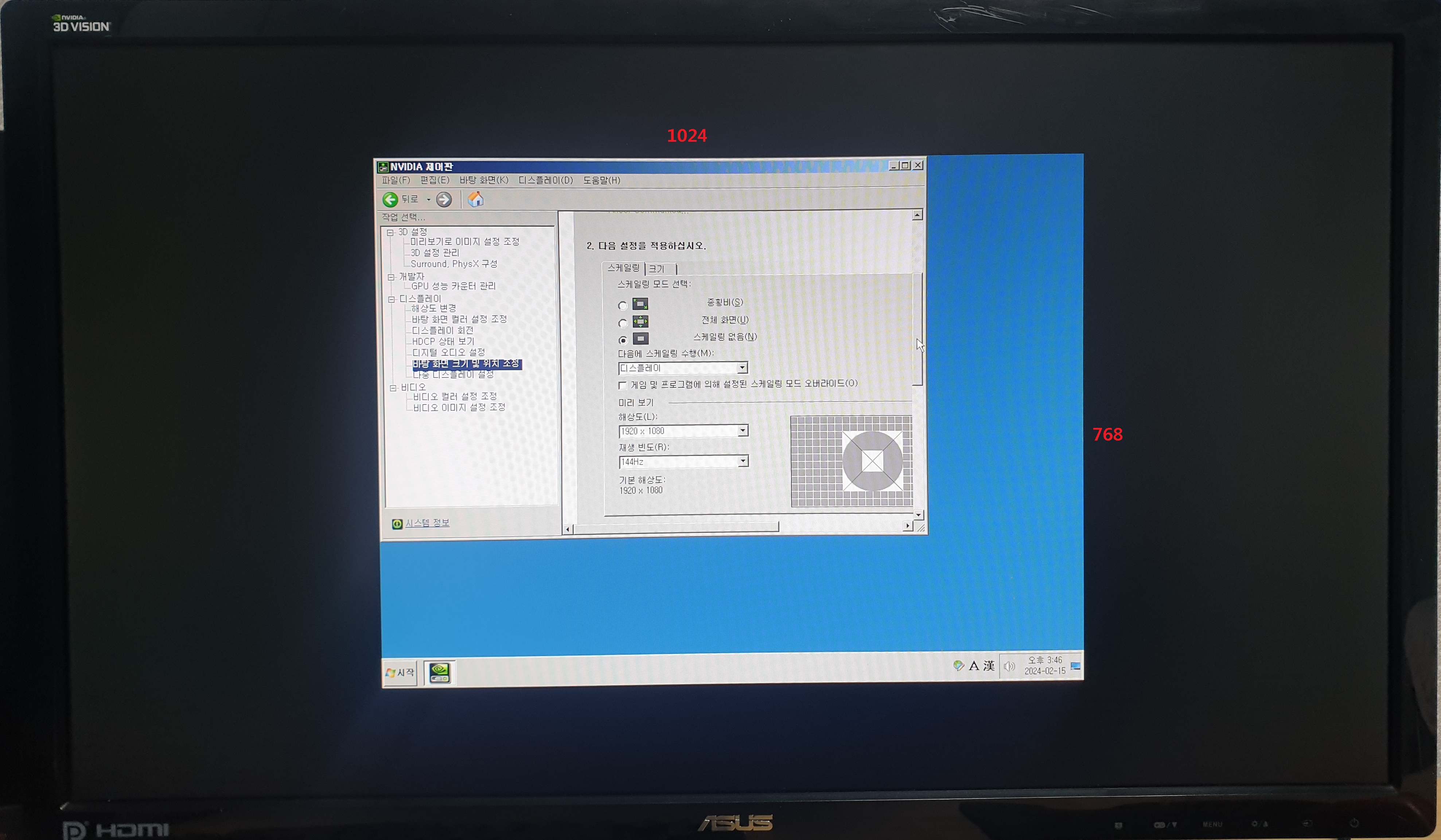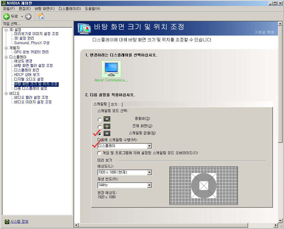 스케일링 모드는 "화면 해상도를 모니터 크기에 맞게(여백없이) 늘린다" 라고 생각하면 됩니다.
