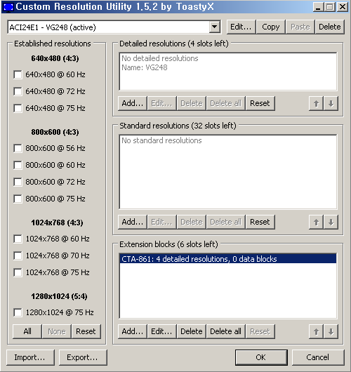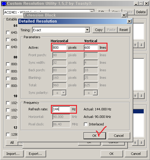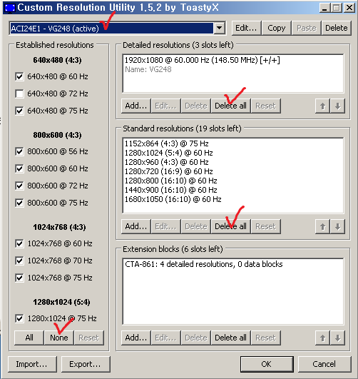 1. CRU.exe 프로그램을 실행 후 active(현재 활성화 중인 모니터) 확인