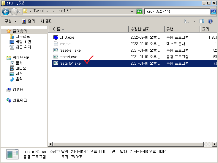 6. CRU-1.5.2 폴더에서 "restart64.exe" 를 실행 합니다.
