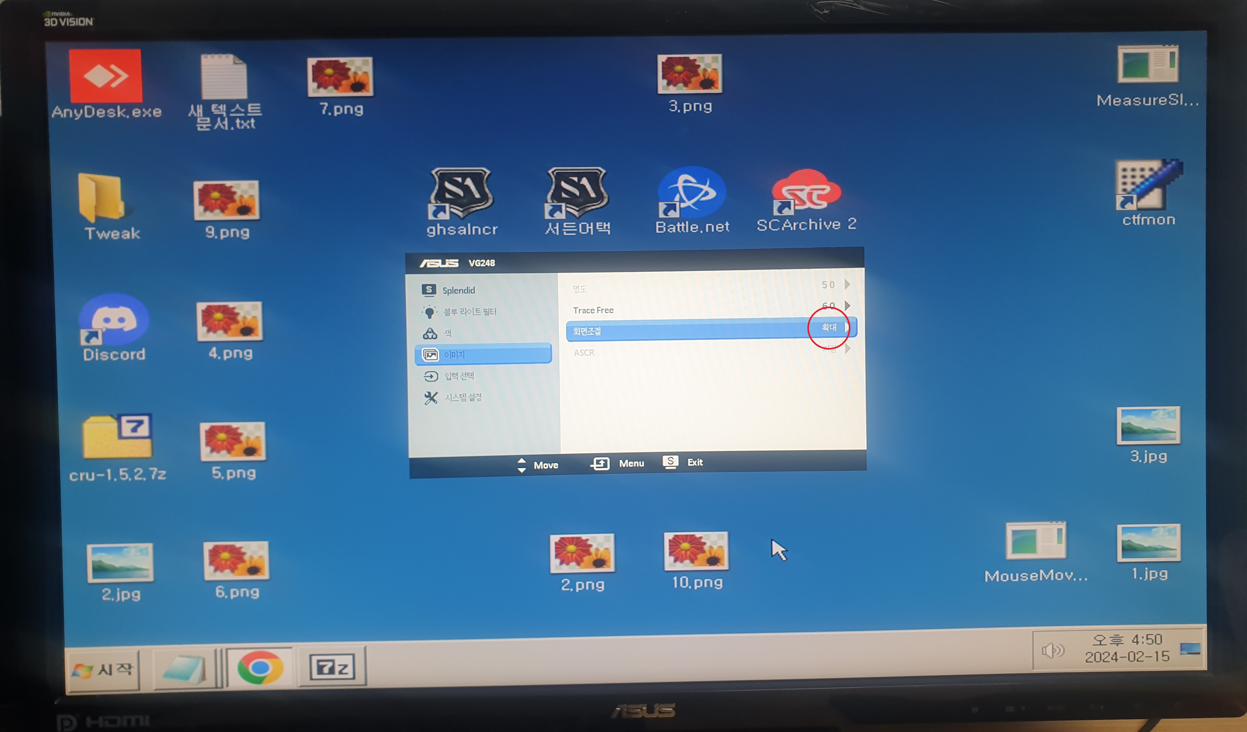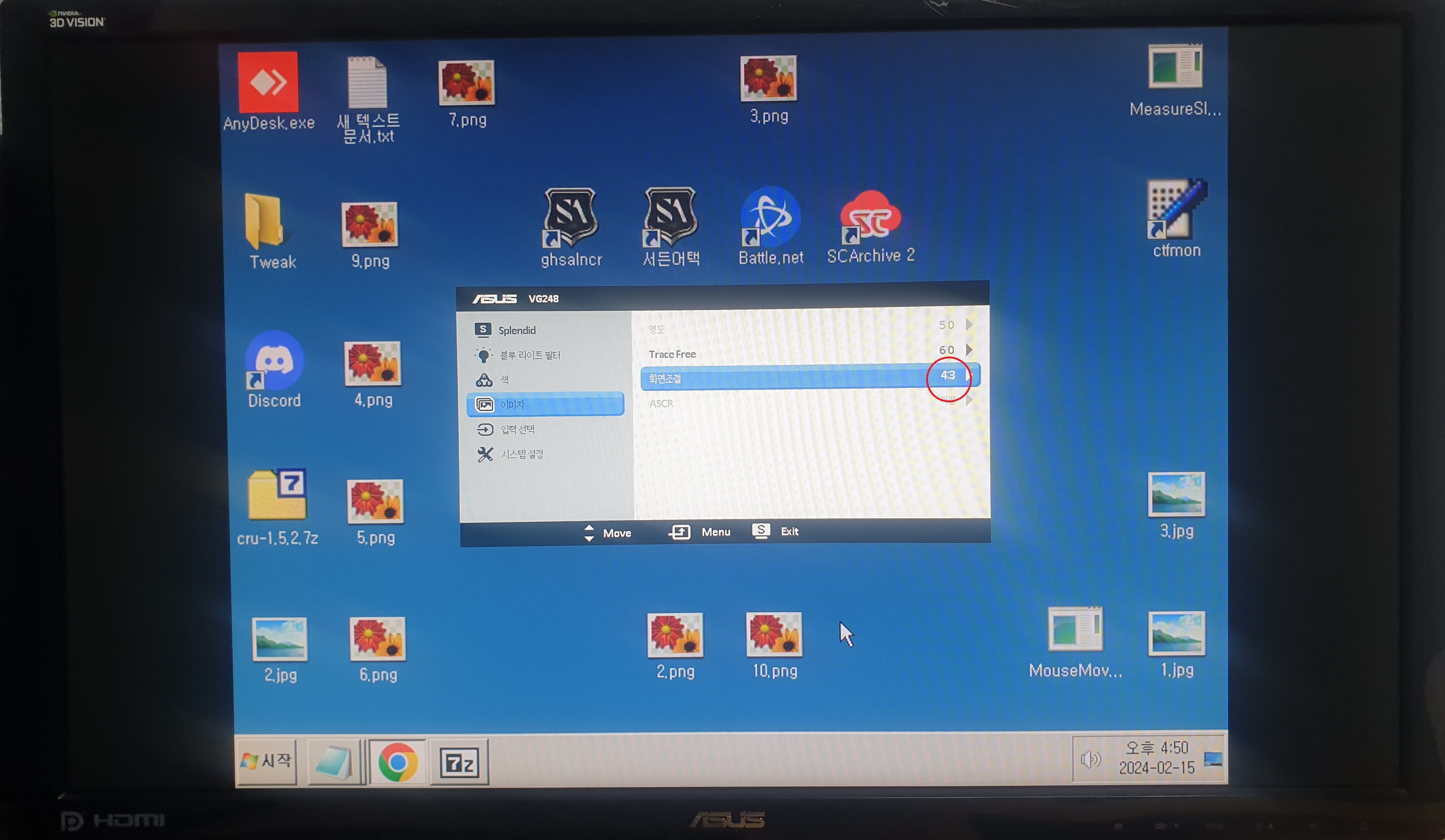 8. 모니터 메뉴 설정(OSD)에서 종횡비(4:3) 혹은 전체화면(Stretched)으로 설정해주세요.