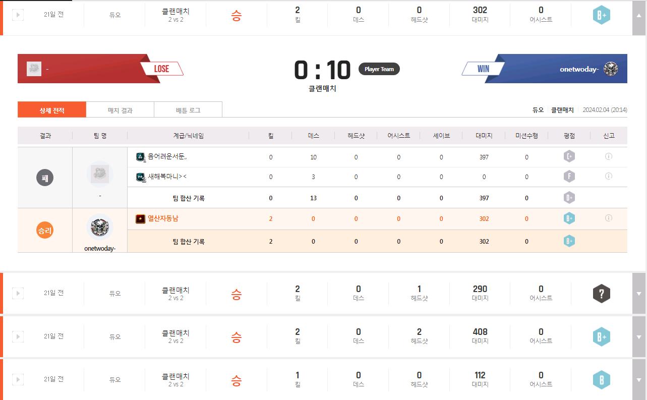 https://barracks.sa.nexon.com/1376706107/match<병영 클랜전 기록 내리시면 있습니다 다들 병영에서 신고한번씩 부탁드립니다