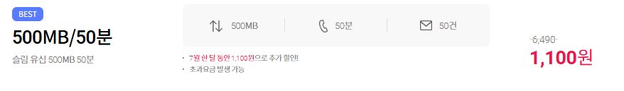 7월 한정 슬림유심 500MB 50분 월 1,100원 적극 추천드립니다!