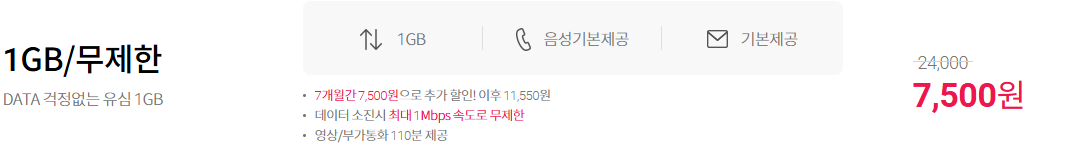 ※ 데이터 소진 시 최대 1Mbps 속도로 무제한 / 7개월간 7,500원 이후 11,550원