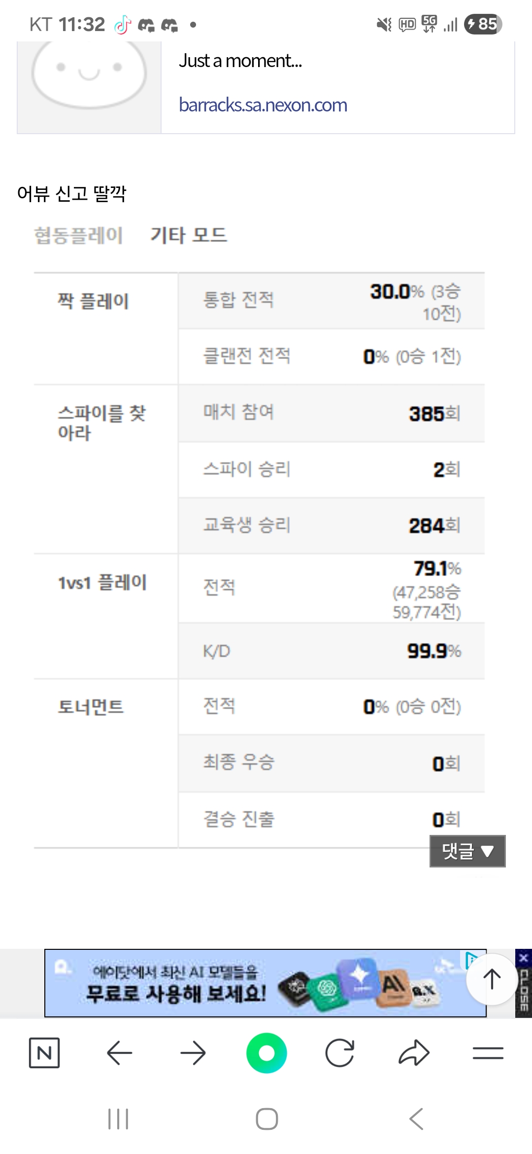 킬뎃보시면 순겜이라하기엔 너무하는 킬뎃아닌가여https://barracks.sa.nexon.com/721559510/match위엔 병영수첩 다들 신고한번씩 부탁드립니다