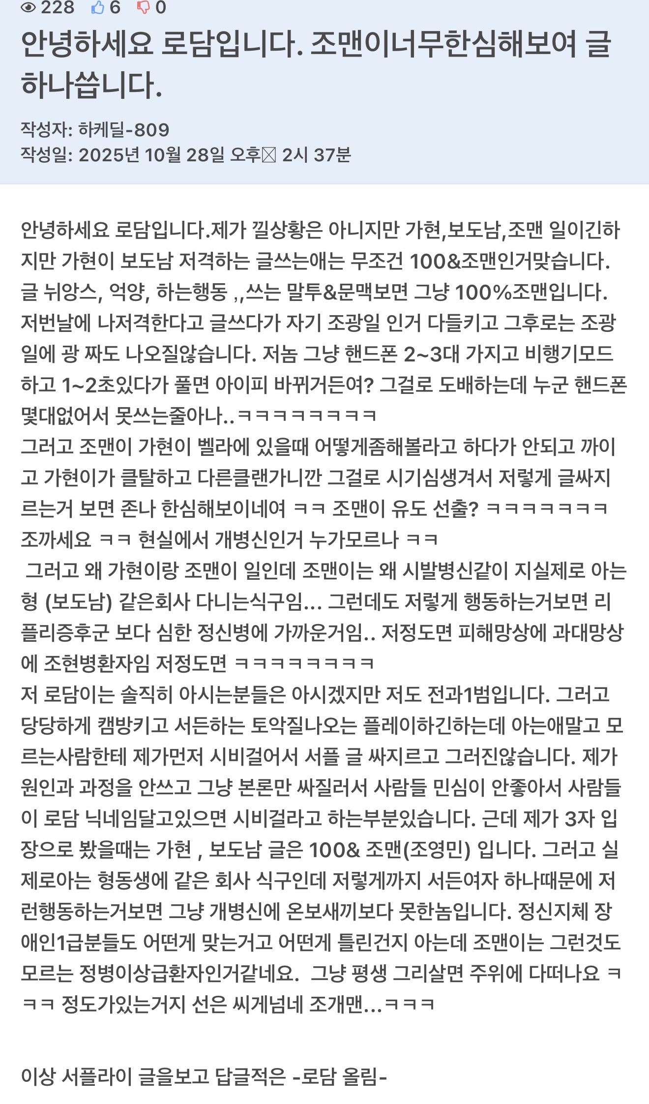 안녕하세요 로담입니다. 돈 400빌려놓고 안갚는애 연락해라잉