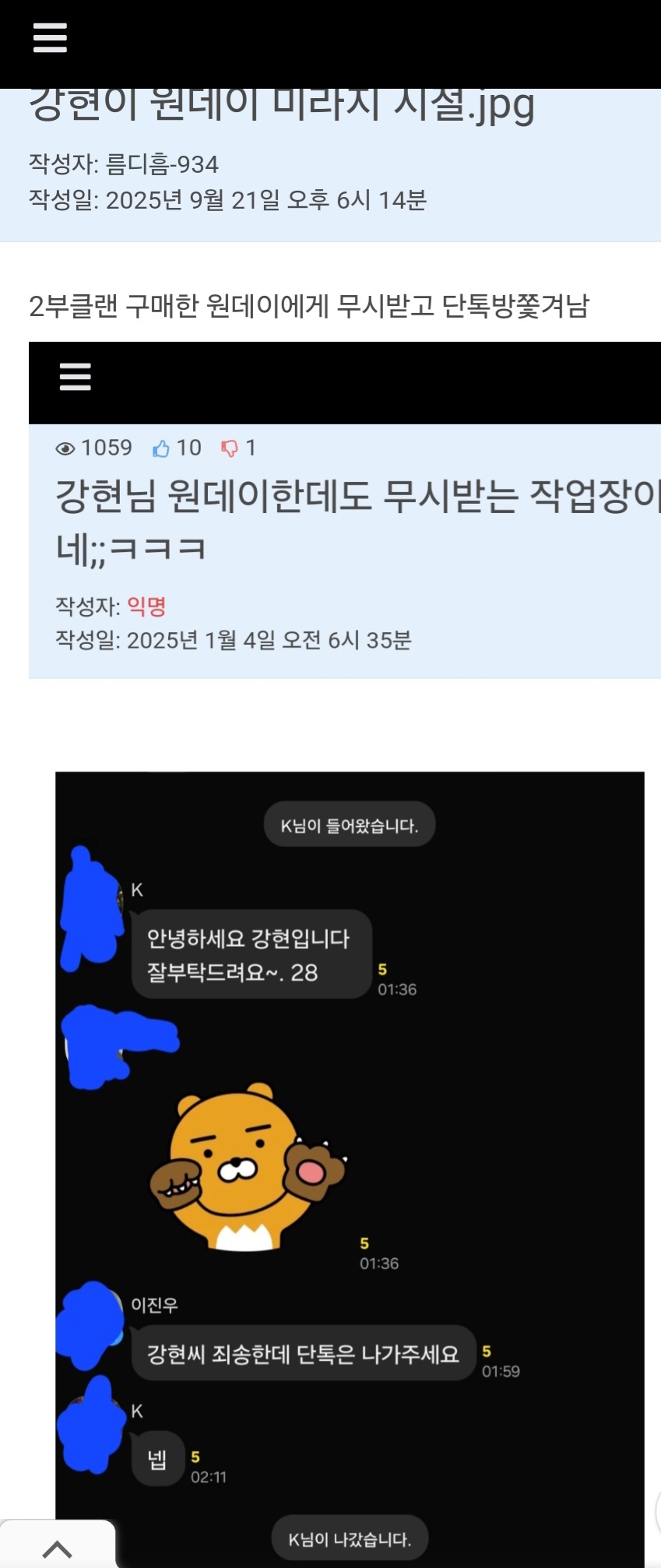 님 열산에서 처음에 원데이클랜 왜짤렸냐고 물어볼때마다 진우 욕 하면서 본인이 나간거라고 그렇게 말하더니 메세 짤리니까 2부 갈곳없어서 다시 원데이클랜 가셨네요 ㅋㅋㅋ 자존심도 없나 뒤에서 욕하더니 클랜 다시받아주니 형님 거리네 ㅋㅋㅋㅋㅋ 도대체 2부할 실력이 안되는데 클랜은 뒤지게 2부만 갈려고 하네 3부로 꺼지지좀 ㅋㅋㅋ 자존심도 없는놈