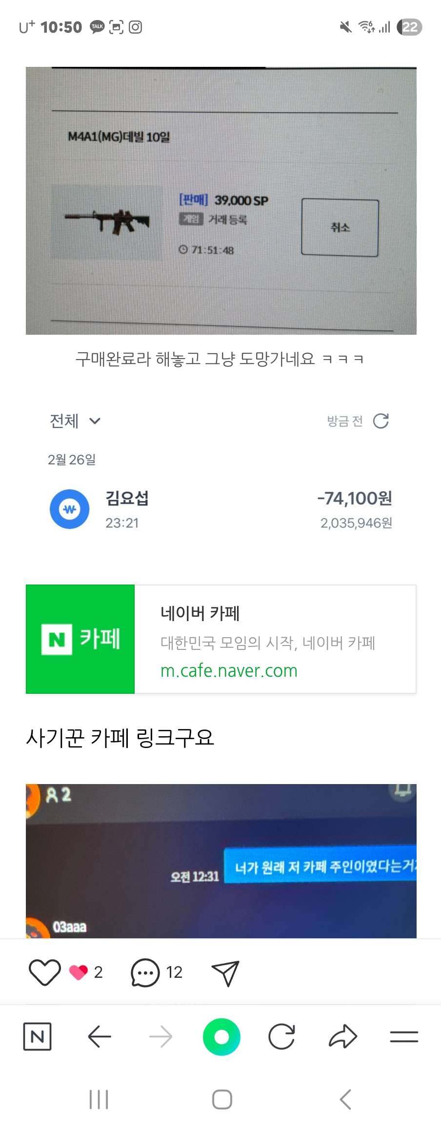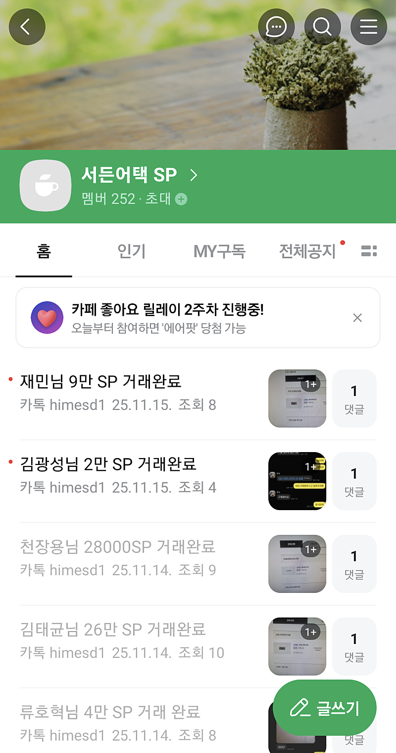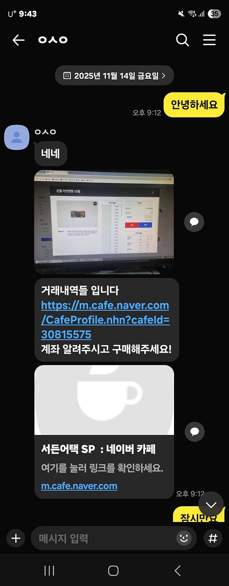 카페에 거래내역들 구매내역들이라고 카페링크주고