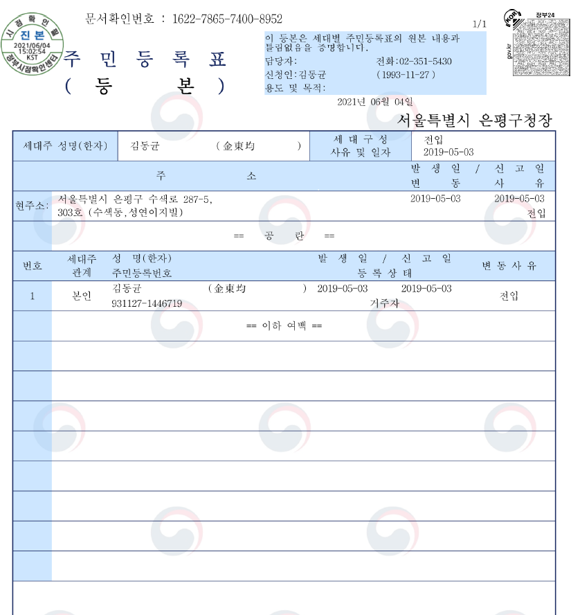 서울특별시 은평구 수색로 287-5  성연이지빌 303호에 사시는 김동균씨  그만깝싸고 다니세요