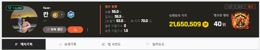 https://barracks.sa.nexon.com/218722571/match(칸) 현 솔랭40위