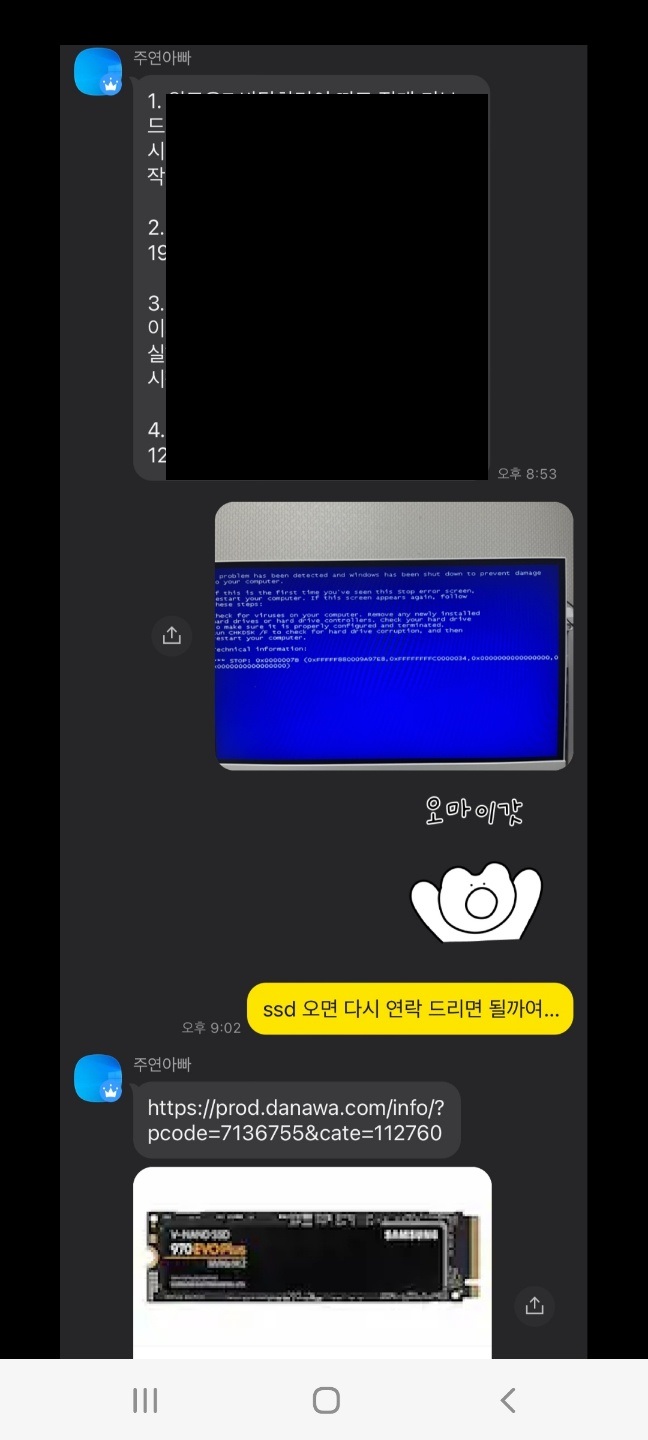 어김없이 블루스크린이 떠버렸고 ssd 를 바꿔야 한다고 택배로 자기가 갖고있는 ssd를 5만원에 보내주겠다 이런식으로 나오셨고
