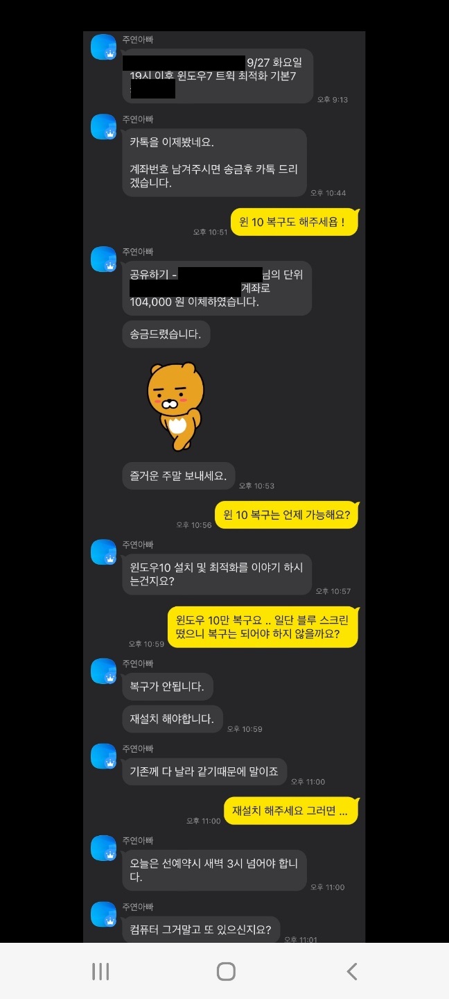 환불은 받았는데 윈도우10 복원해달라니까 예약때문에 새벽이나 나중에 된대서