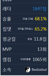 이성민이였으면 70퍼쏨 ㅄ들.. 시즌초반에 천상계 65퍼엿는데 라플하고 전적쌓여서 61퍼된거지 47전 2부따리하면 70퍼무조건넘는다