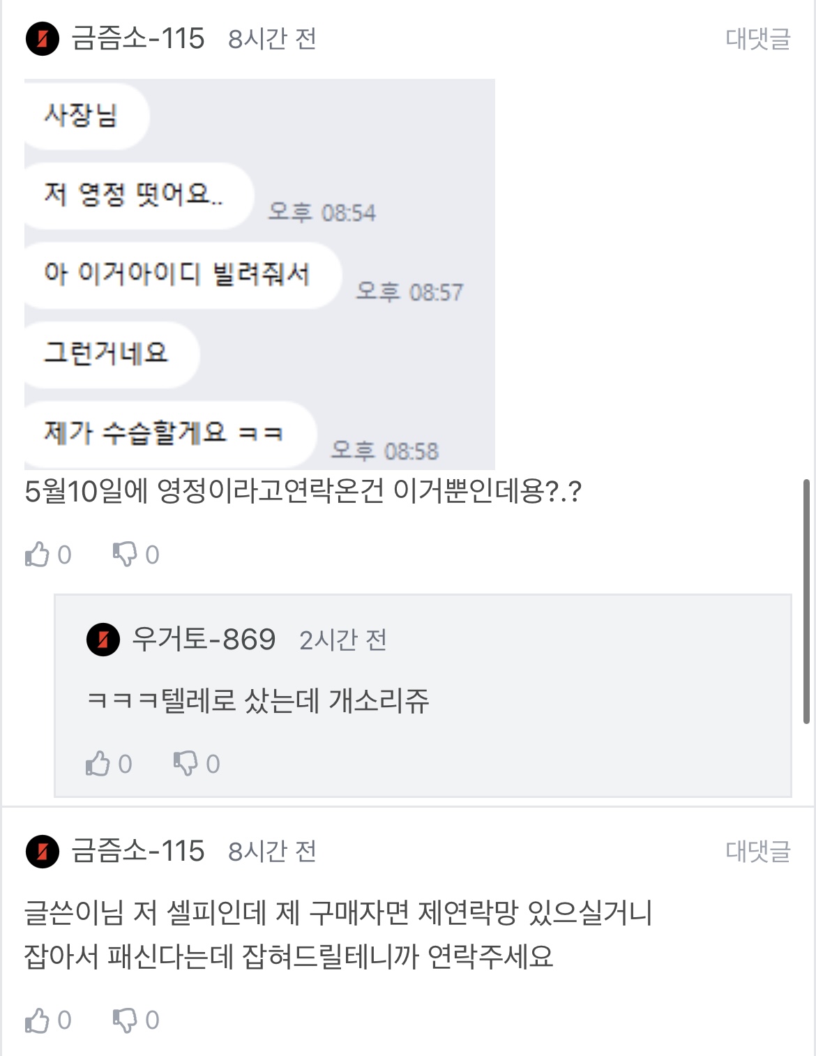 금즘소-115(셀피)가 댓글로 "5월 10일에 영정이라고 대화온건 이거밖에 없다"며 자기 고객한테 메시지온거를 캡쳐해서 올림