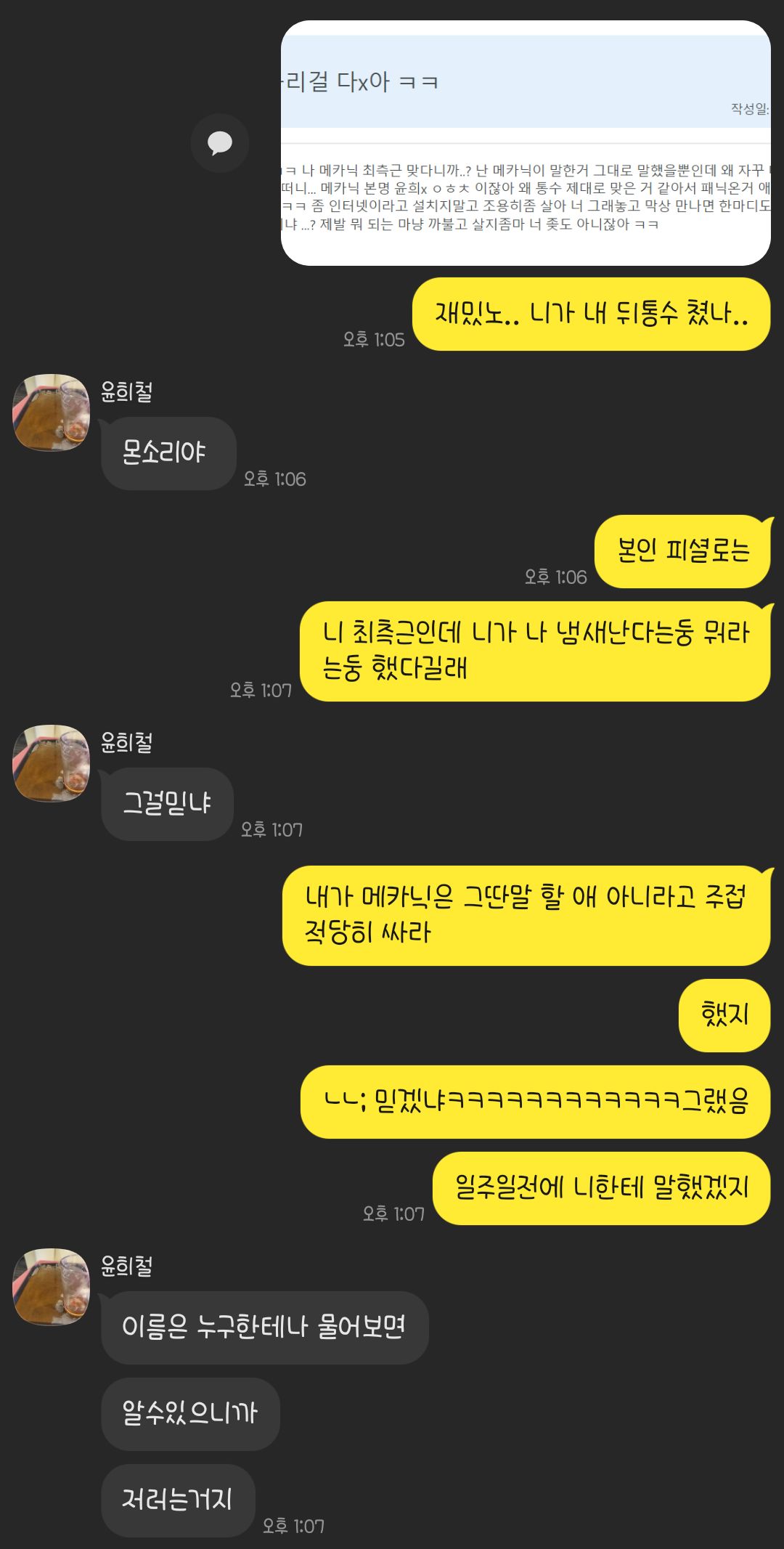그리고 나는 니가 메카닉의 최측근이 아니라고 확신을 가진게 니가 진짜 메카닉의 최측근이었음 분명 저런 말 안한다는거 니가 더 잘 알았을거임