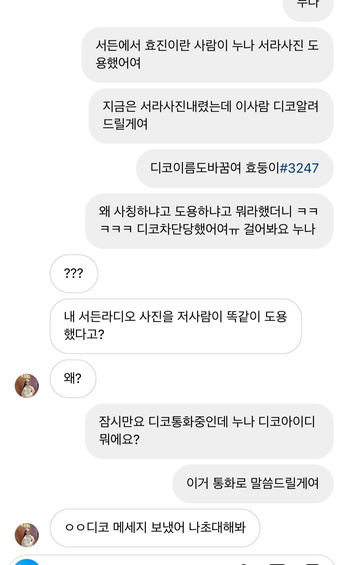 목소리랑 이름부터가 다른데 그래서 본인 아니지않냐 저사진 주인이랑 지인이라니까 서라랑 디코 싹다 차단박으셨네요?