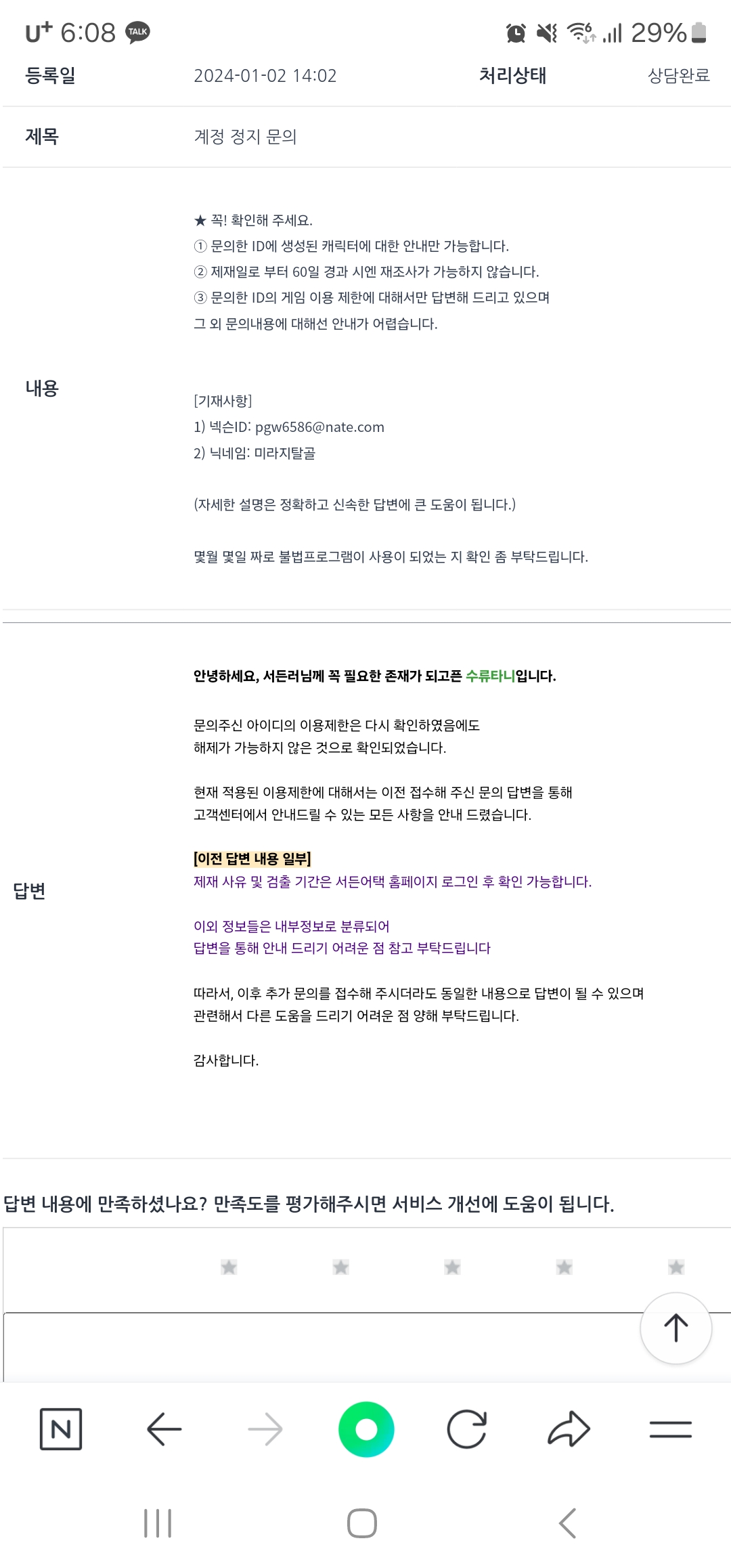 현재 적용된 이용제한에 대해서는 이전 접수해 주신 문의 답변을 통해