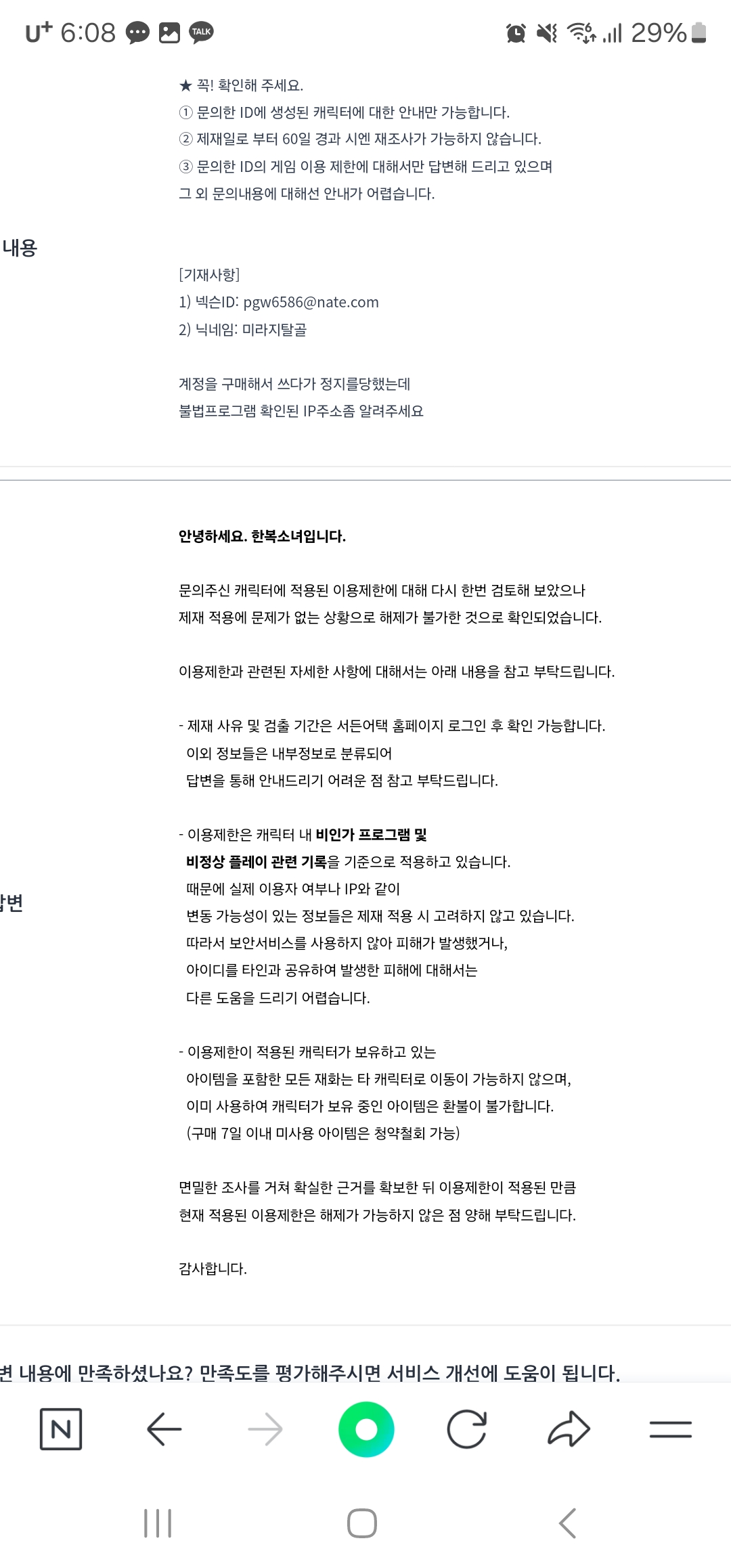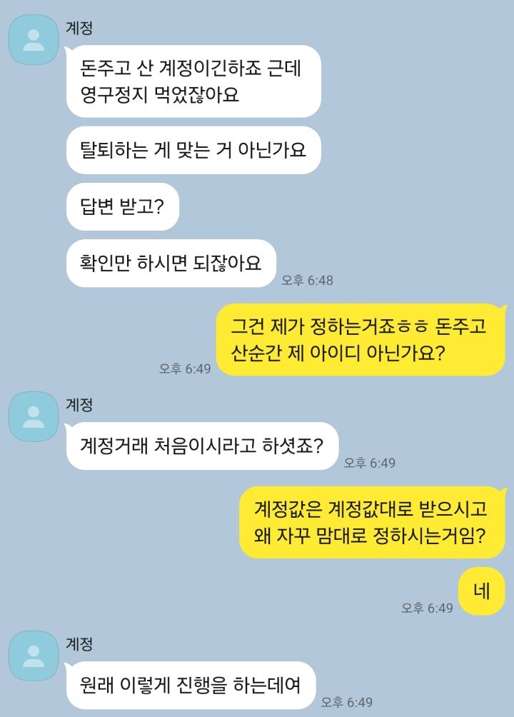 고객센터 문의내용 및 캘뭉님과 대화한 카톡내용 추가로 남깁니다. 살 당시에는 캘뭉님이 전과자인걸 몰랐던 상태이고 돈입금하고나니 정보는 본인친구 아이디라 정보를 못준다는 식으로 이야기하길래 그냥 해킹 안하시리라 믿고 쓰겠다고하고 사용했습니다.