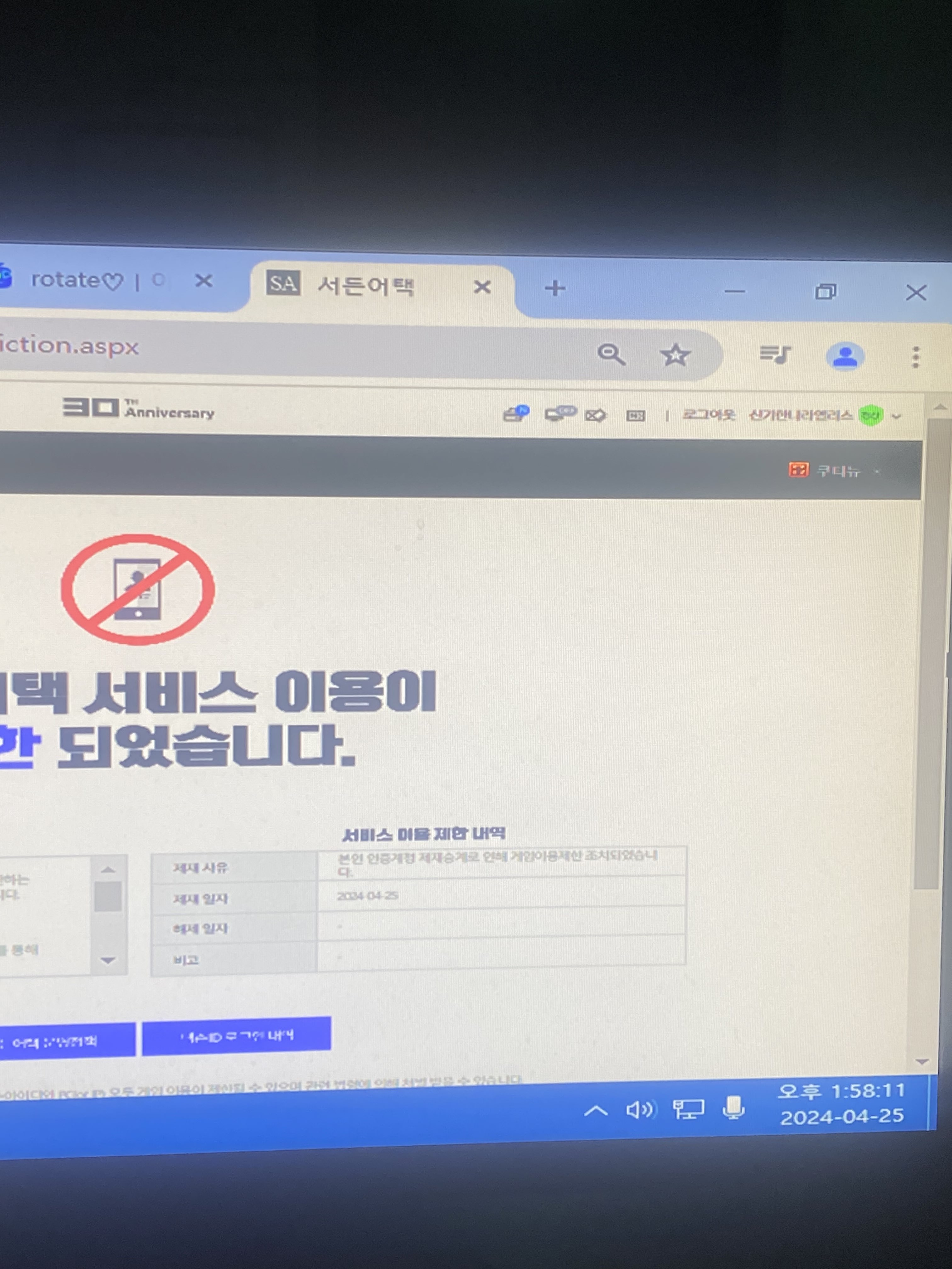 본캐 로그인하면 제재사유가 저렇게 뜨는데
