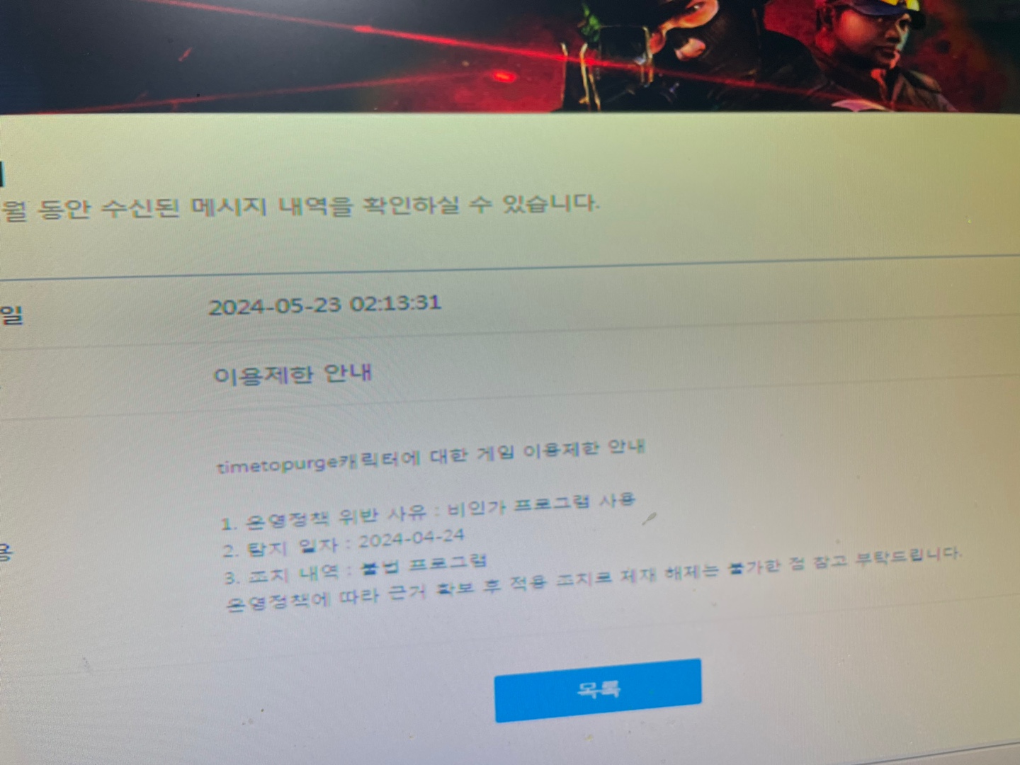 4월 24일날 비인가 프로그램으로 5월 23일에 영구 정지 당했습니다