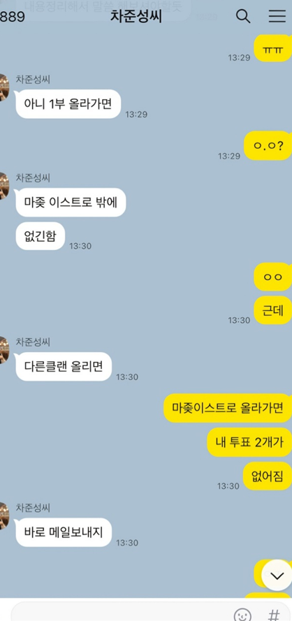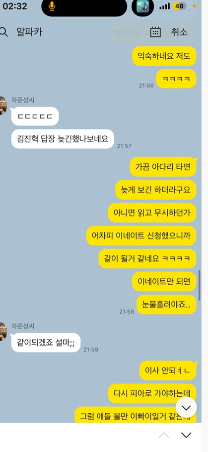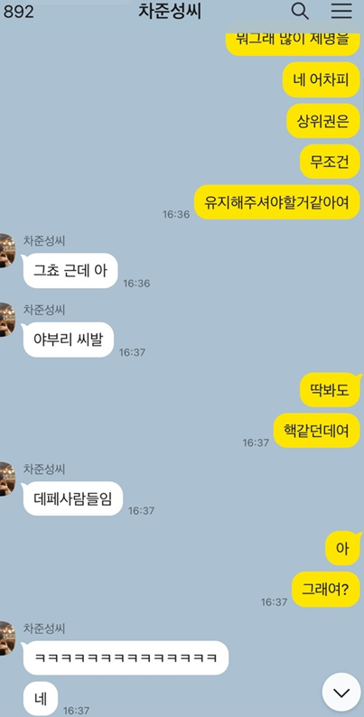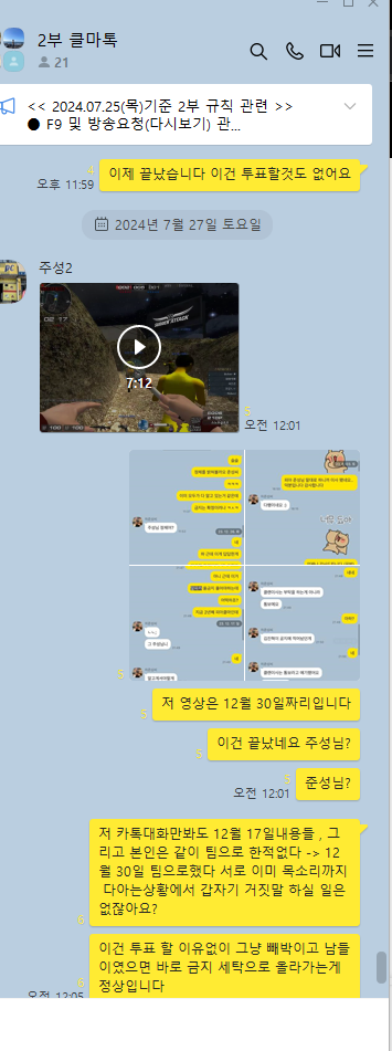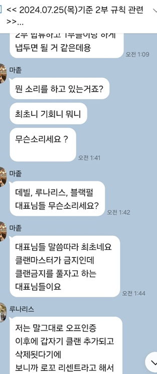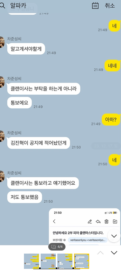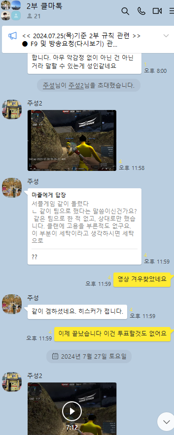아직도 20명가량 남아계신 클마단톡방은 마설님의 모든 증거사진 및 엪구 풀영상이 있고 저의 주장들이 그대로 남아있는것을 보고 계심에도 불구하고 마설님이 새로만든 단톡방에 어떠한 언급 자체가 지금까지도 일체 없는 상황입니다.