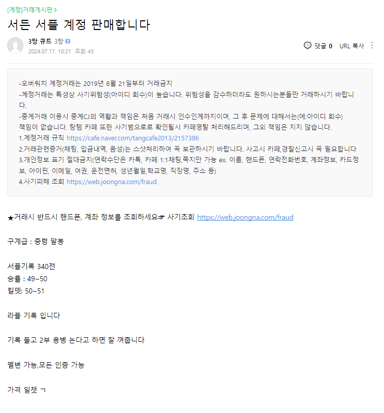 캡쳐본보시면 일단 계정산사람도 이중클맞네요ㅎㅎ 본캐가따로잇어서 키울려는거라 <