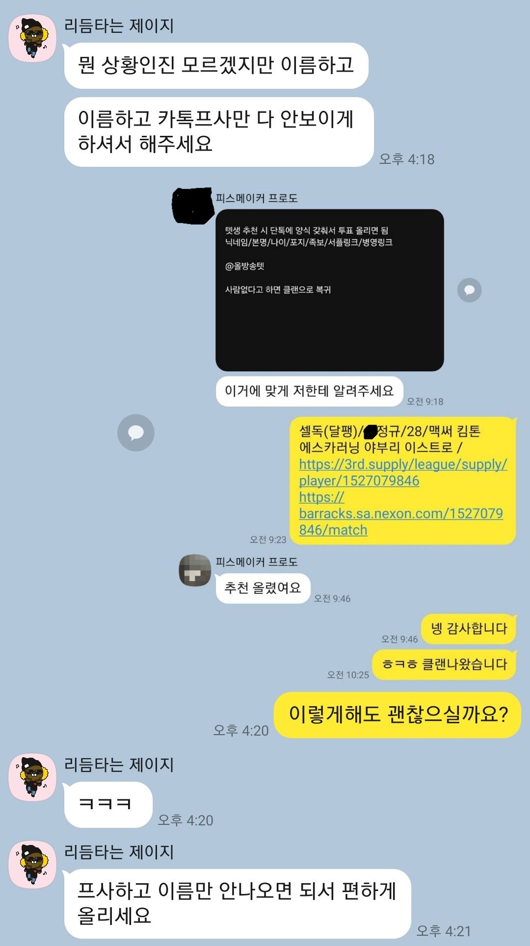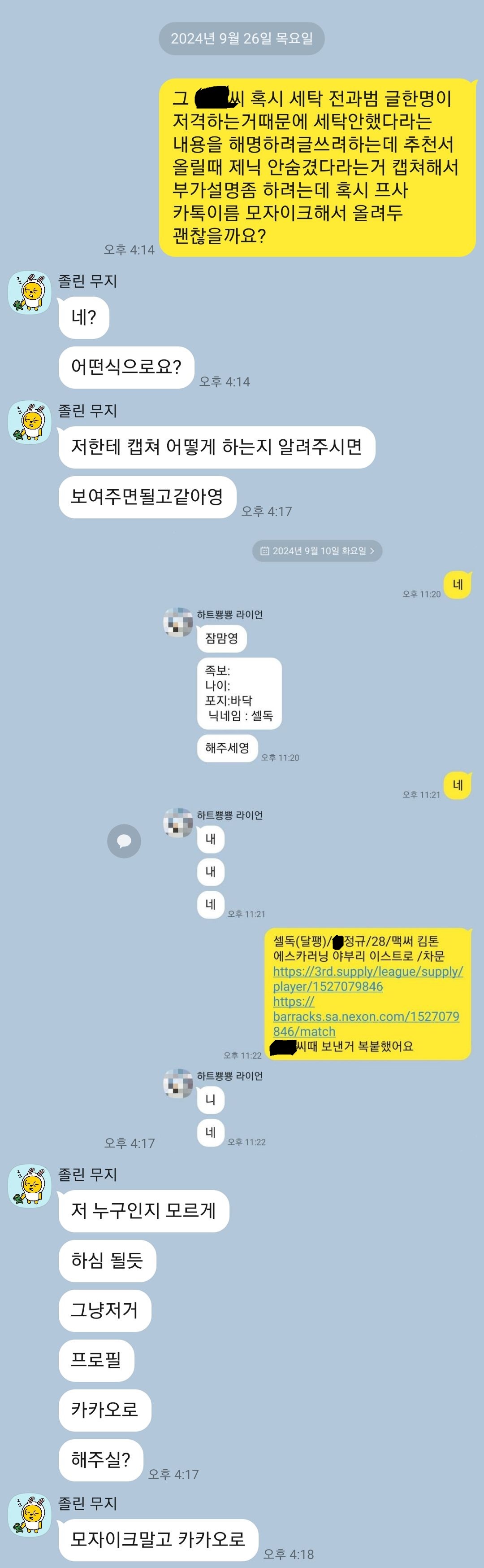 카톡익명으로 썼다 왜 프사가렸냐 이름가렸냐 하시고 꼬투리 잡으실까봐 본인분들께도