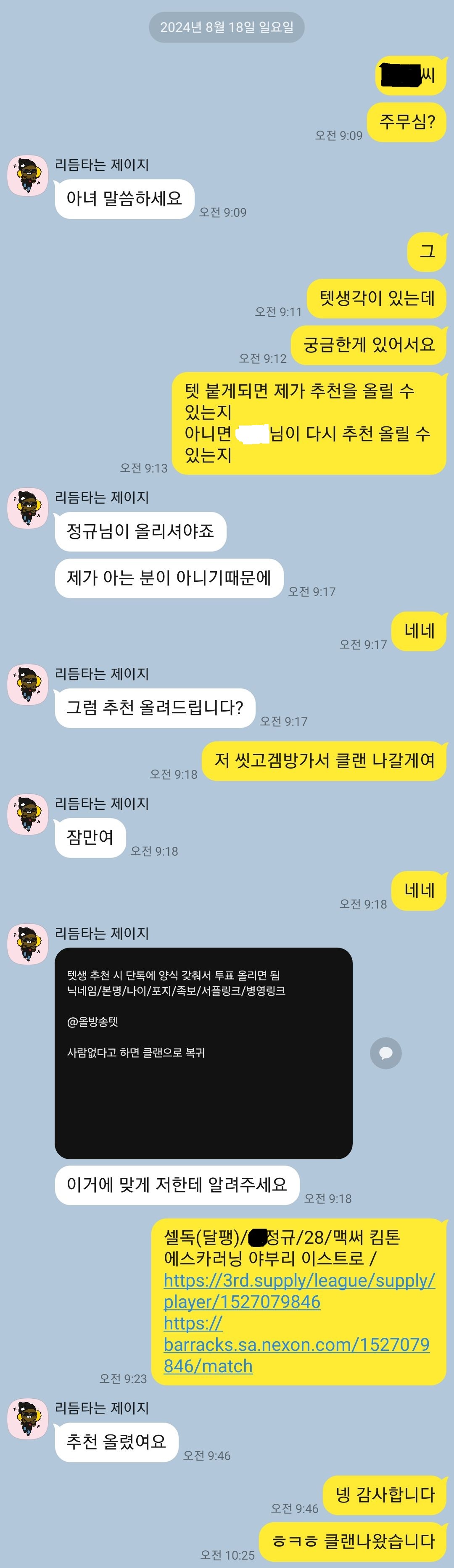 여쭤봤습니다. 익명을 원하셨고 이부분에 대해선 클랜운영진분들이나 부마님 클마님께