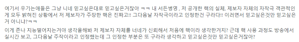 이게 존나 지능떨어지는거야 생각을해봐 저 제보자 자체를 너네가 신뢰해서 처음에 핵이라 생각한거지? 근데 핵 사용 과정도 방송에서 실시간 보고, 그다음날 주작이라고 인정했는데 그 인정한 부분은 또 구라라 생각하고 믿고싶은것만 믿고싶은거잖아?