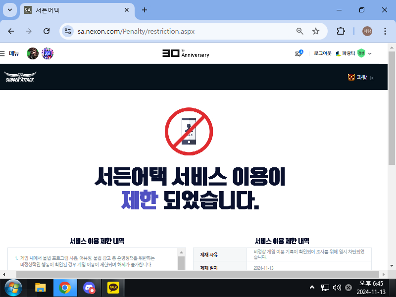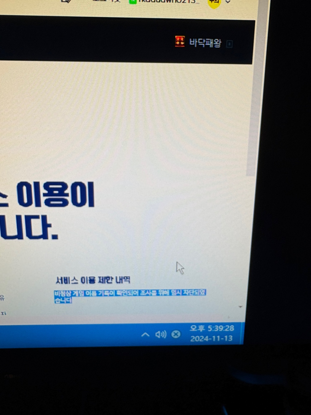 비정상 게임 이용 기록이 확인되어 조사를 위해 임시 차단되었습니다. 라고 뜹니다