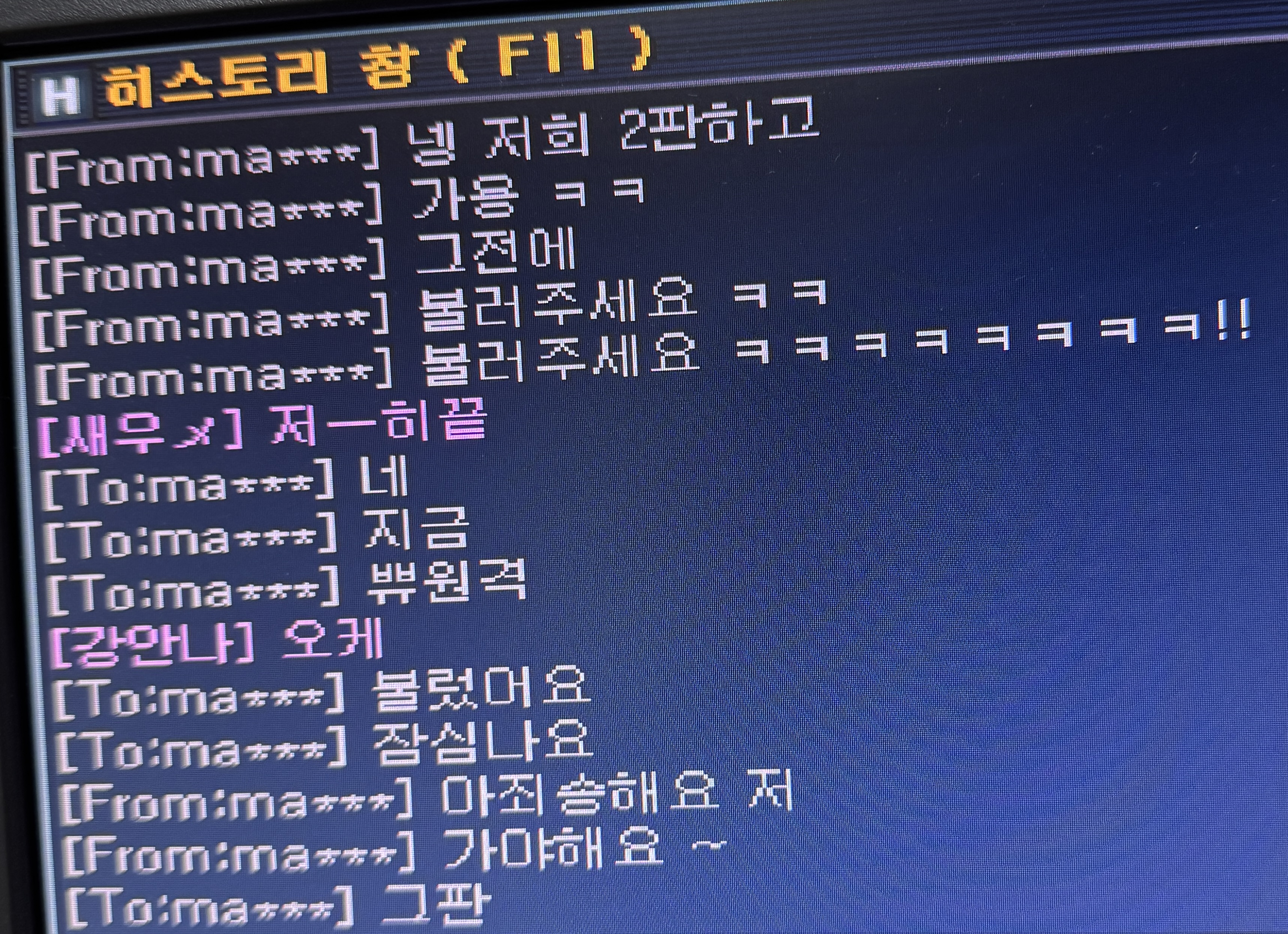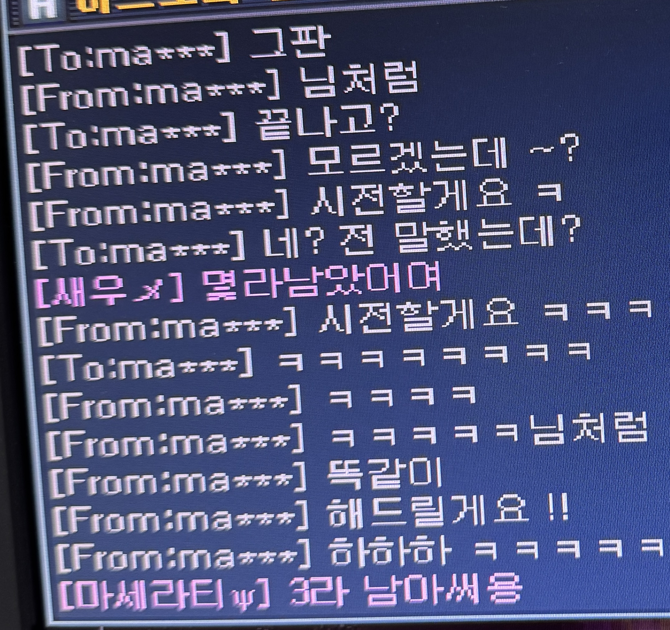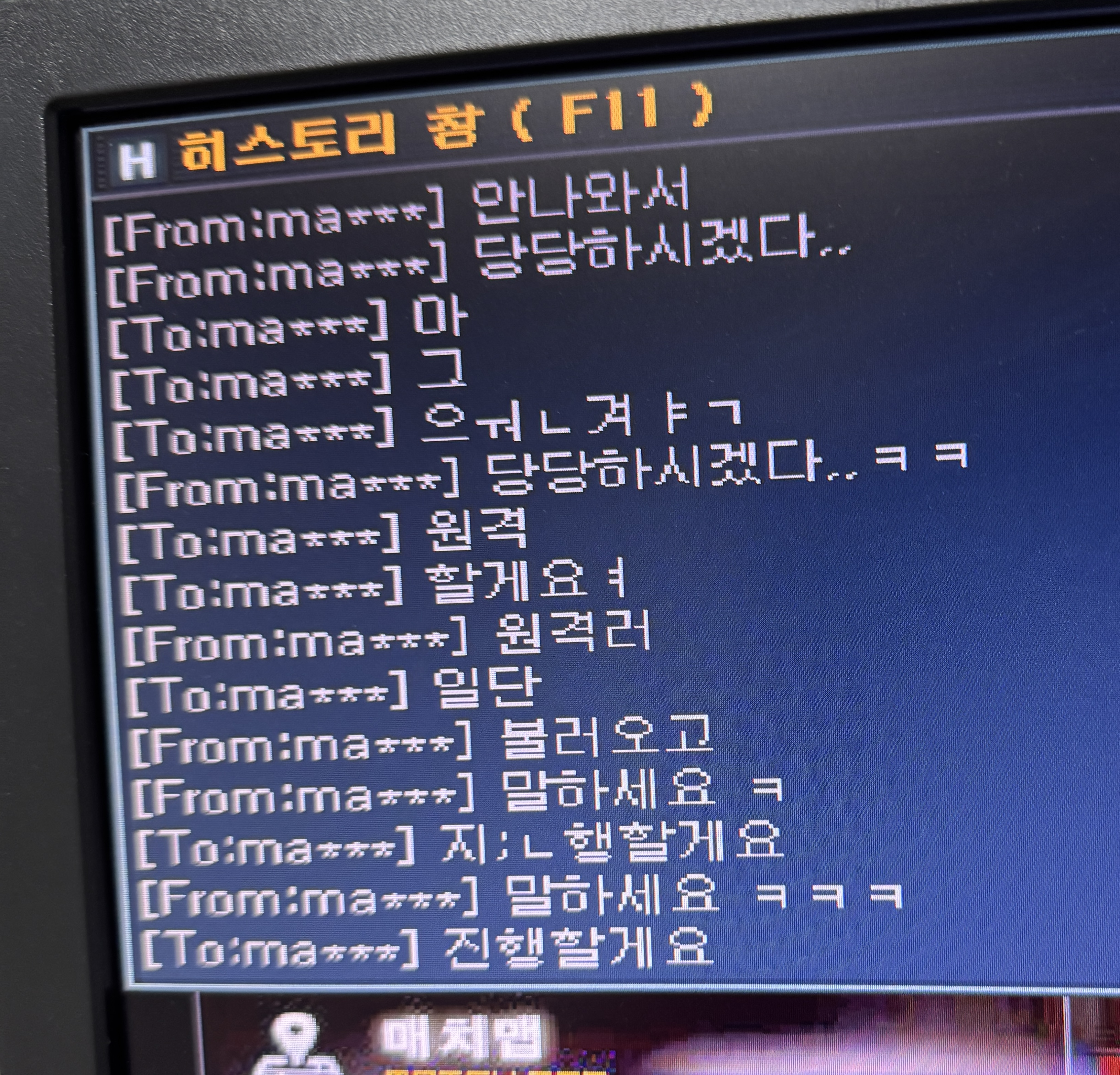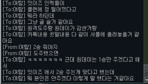 일단 상황 정리 한번 하자면 미스유님한테 귓으로 보시다시피 원격을 하겠다고 했는데 원격을 하겠다고 한 이유는 개념없이 계속 저를 비꼬는 식으로 말하고 원격도주한적도 없는데 도주했다고 하시고 그래서 너무 괘씸해서 원격을 걸어버린 상황입니다